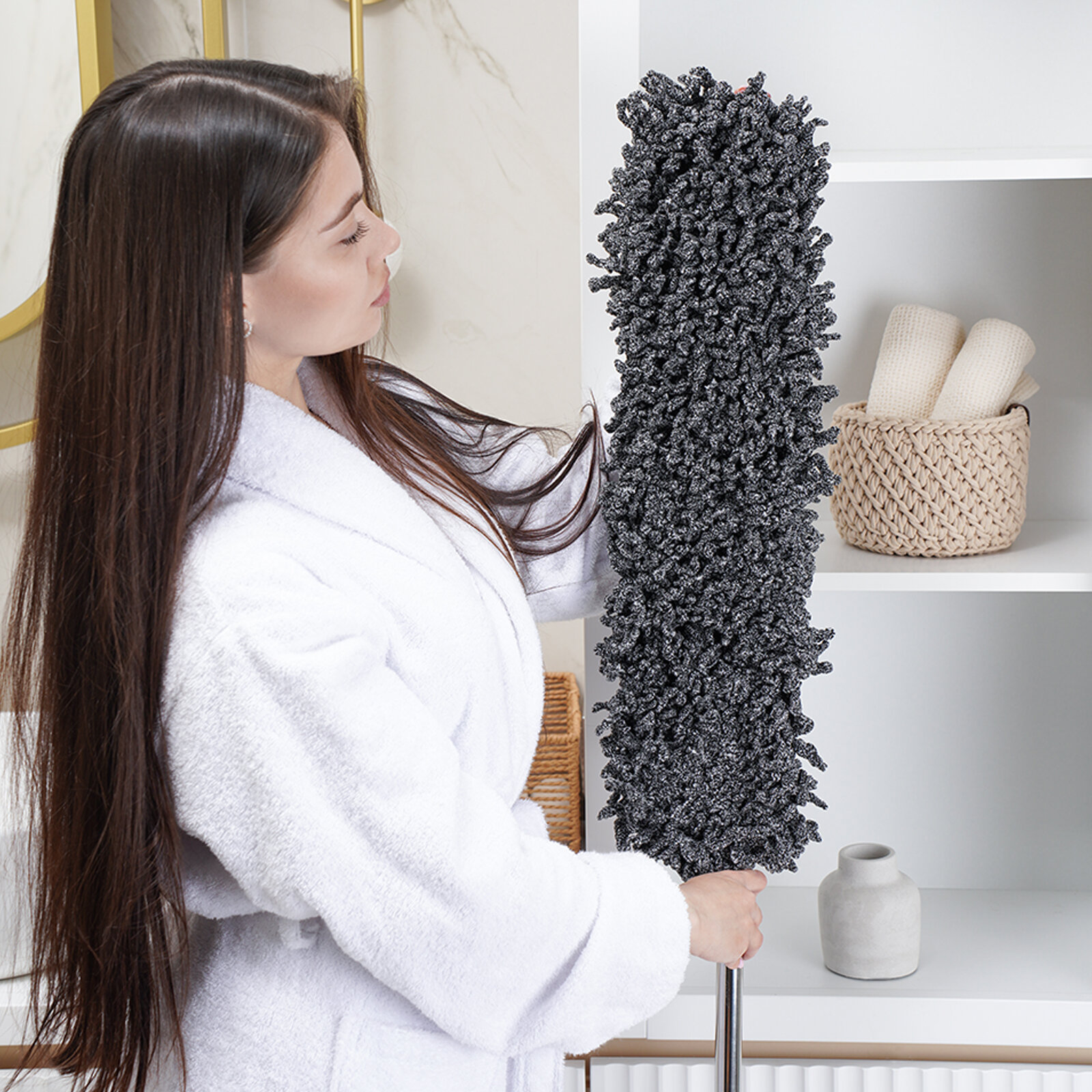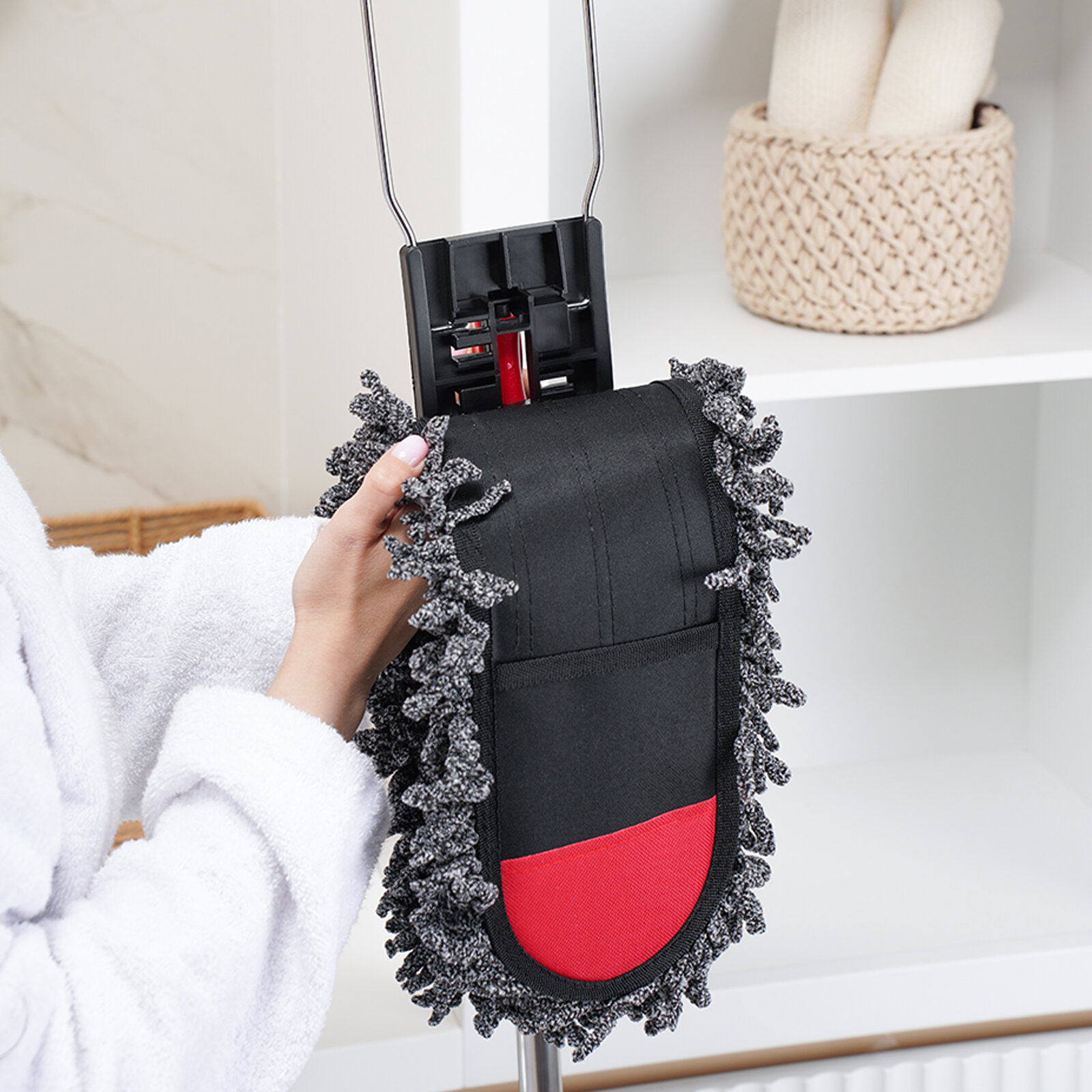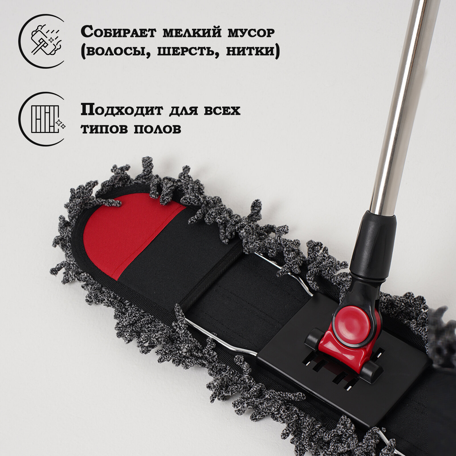Преимущества швабры: телескопическую ручку можно регулировать по высоте, насадка из микрофибры хорошо впитывает воду и отмывает поверхность, подходит для всех типов полов, собирает мелкий мусор, такой как волосы, шерсть, нитк