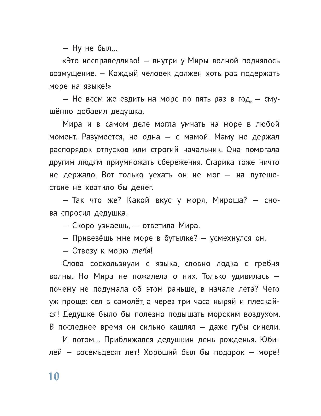 "Привет, я твоя внучка Мирослава. Вы с моей мамой в ссоре. Но мы-то можем дружить? Правда?" Так у Мирославы появился дедушка, а у деда Димы - внучка. Целое лето она навещала его втайне от всех, а однажды узнала, что дедушка ни разу не был на море. Но с таким мечтательным видом прикладывал к уху ракушку и спрашивал, правда ли море солёное… Поездка к морю - вот лучший подарок дедушке на юбилей, решает Мира и разрабатывает план. Ей нужно серьёзно, по-деловому поговорить с мамой и перехитрить суровую няню, разработать маршрут и купить билеты. Мира ещё не знает, что в какой-то момент поездка пойдёт не по плану и перевернёт всю её жизнь, и не только её.
