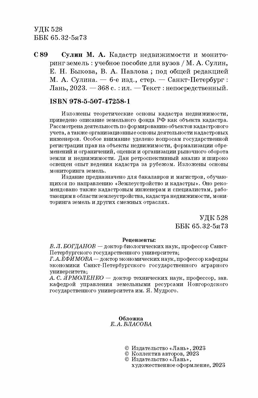 Кадастр недвижимости и мониторинг земель. Учебное пособие для вузов (Сулин Михаил Александрович, Быкова Елена Николаевна, Павлова Виктория Александровна); Лань, 2022