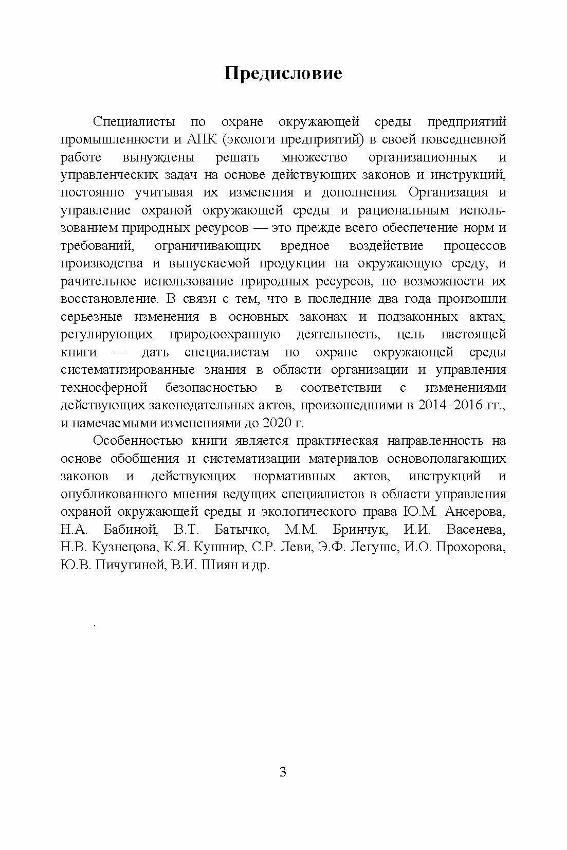 Книга предназначена для экологов-специалистов по охране окружающей среды предприятий промышленности и АПК и посвящена вопросам, которые должны решать экологи предприятий в своей повседневной работе. Это прежде всего вопросы организации и управления охраной окружающей среды на предприятиях различных форм собственности и видов деятельности. В книге обобщены и систематизированы материалы основных законодательных актов РФ, инструкций и руководящих материалов с учетом изменений, вступивших в силу в 2015-2016 гг. и тех, которые начнут действовать с 2017 по 2020 гг. Показаны новшества в нормативно-правовом регулировании охраны окружающей среды, надзоре и контроле за экологической безопасностью. Приведены механизмы экономического стимулирования экологической безопасности, страхования ответственности за возможные нарушения. Представлены материалы по ответственности предприятий и их руководителей за нарушения в области охраны окружающей среды.