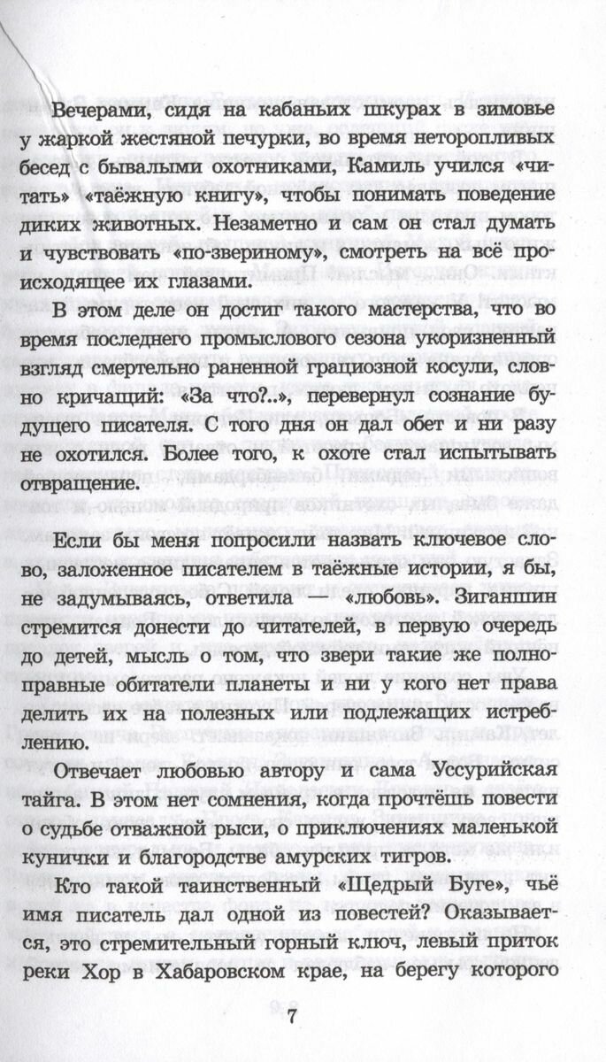 Книга лауреата Президентской премии 2020 года знакомит читателя с природой и животными Дальнего Востока. С полным погружением читатель следит за жизнью куницы ("Маха") и рыси ("Боцман"). Третья же повесть - "Щедрый Буге" - рассказывает об одном охотничьем сезоне в Уссурийской тайге. Герой постигает таёжную азбуку, учась читать следы, понимать поведение и повадки животных. Попутно описывается быт промысловиков, уклад жизни удэгейских охотников - небольшого коренного народа нашей страны.