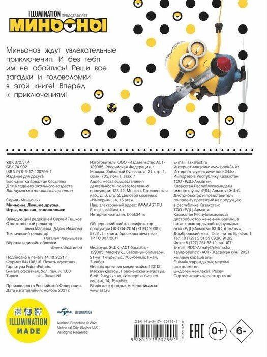 Миньонов ждут увлекательные приключения. И без тебя им не обойтись! Реши все загадки и головоломки в этой книге! Вперёд к приключениям!