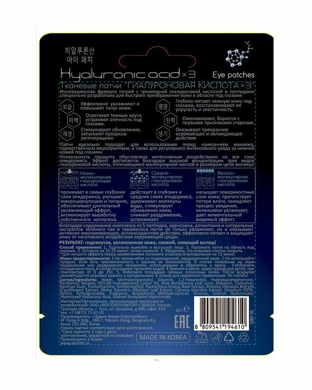 Благодаря содержанию комплекса из 5 пептидов, аденозина, аллантоина и натуральных экстрактов зеленого чая и гамамелиса патчи не только увлажняют, но и оказывают активное омолаживающее, антиоксидантное действие, эффективно питают и защищают кожу от негативного воздействия окружающей среды.