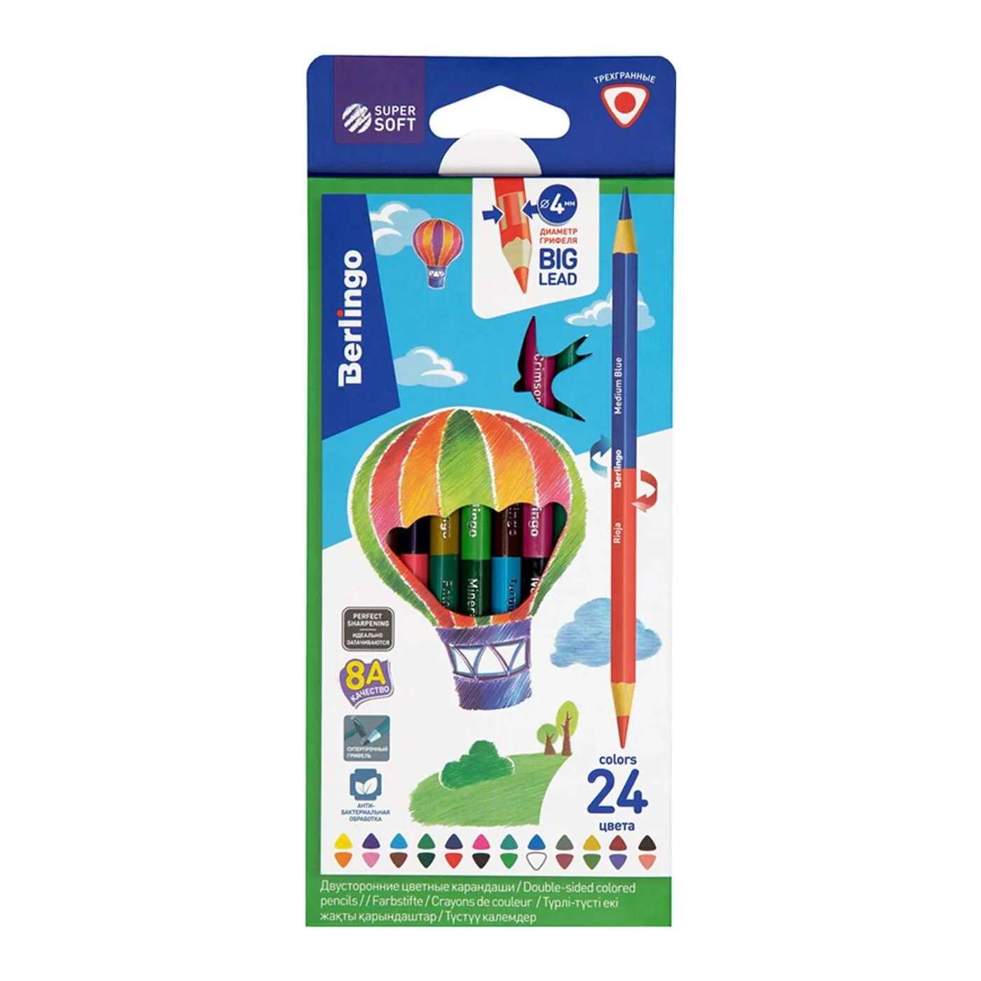 "SuperSoft" - линейка качественно новых цветных карандашей Berlingo. Классическая шестигранная форма. Двусторонние карандаши, 12 карандашей - 24 цвета. Указание цвета на каждом карандаше на английском языке. Поле для подписи имени владельца на каждом карандаше.Грифели высочайшего стандарта качества 8А, являющегося максимальным для нехудожественных цветных карандашей. Мягкость письма, сравнимая с рисованием маслом и пастелью. Яркие насыщенные цвета, обладающие превосходной смешиваемостью. Увеличенная до 3,2 мм толщина грифеля для безупречно комфортного раскрашивания.Уникальная формула и технология производства грифелей, в результате которой достигается одновременно удивительная мягкость письма и прочность, позволяющая грифелю выдерживать даже сильное нажатие под углом 45 градусов. Специальная проклейка, предотвращающая поломку грифеля внутри карандаша при падении. Стойкость к повреждениям.Корпус из древесины высшего качества, прошедшей тщательную обработку. Материал, сохраняющий свою прочность и легко поддающийся ровной заточке без усилий.Уникальная антибактериальная обработка на специализированном оборудовании, гарантирующая безопасное использование продукции детьми.
