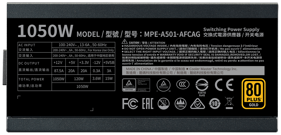 Блок питания ATX Cooler Master MPE-A501-AFCAG-EU 1050W 80 PLUS Gold active PFC 140mm fan full modular MWE Gold 1050 V2