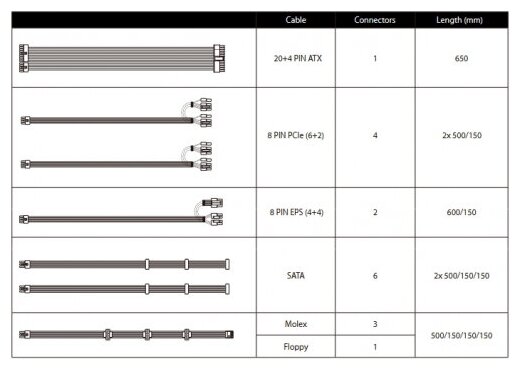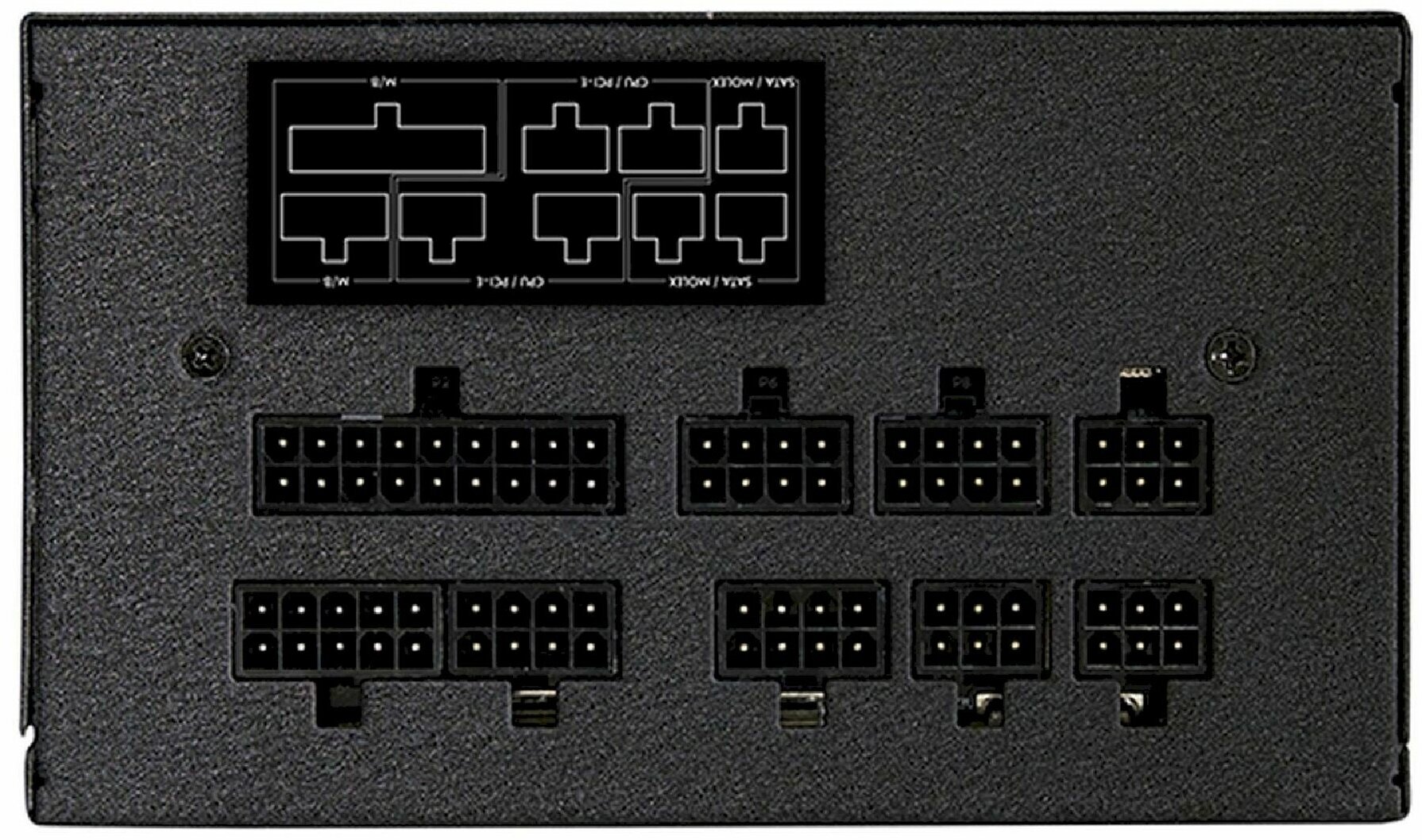 | Разъемы | MB 24 pin, CPU 4+4 pin, видеокарта 4х(6+2) pin, SATA 6 шт, Molex 3 шт, FDD 1 шт |
