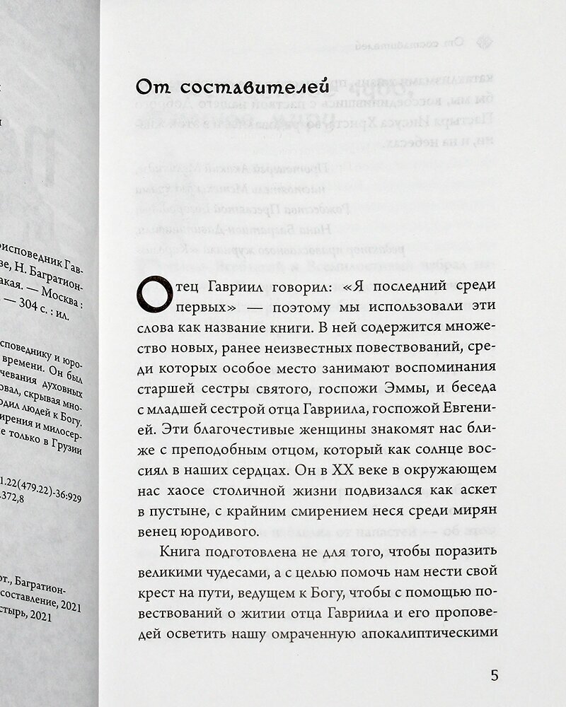 Сборник «Последний среди первых» посвящен преподобному Гавриилу, исповеднику и юродивому, одному из крупнейших святых нашего времени. Он был наделен Всевышним даром прозорливости, врачевания духовных и телесных недугов. Отец Гавриил часто юродствовал, скрывая многочисленные дары Святого Духа и любовью приводил людей к Богу. Он был мудрым пастырем, образцом кротости, смирения и милосердия. Почитание преподобного Гавриила растет не только в Грузии и России, но и во всем православном мире.