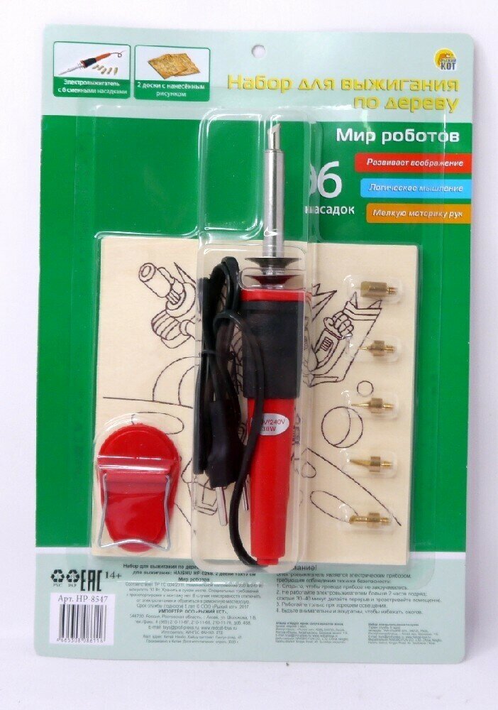 В комплекте: 2 доски с нанесенным рисунком (15х15 см), электровыжигатель, 6 насадок.