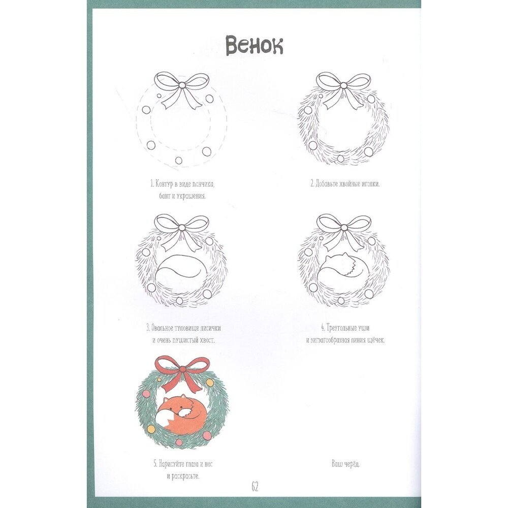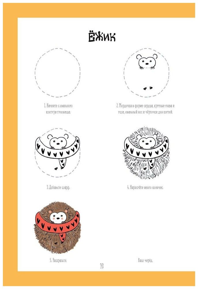 На каждом развороте с одной стороны идет пошаговое описание как рисовать и есть место для пробы своего рисунка, на другой стороне уже надо нарисовать весь полноценный рисунок.