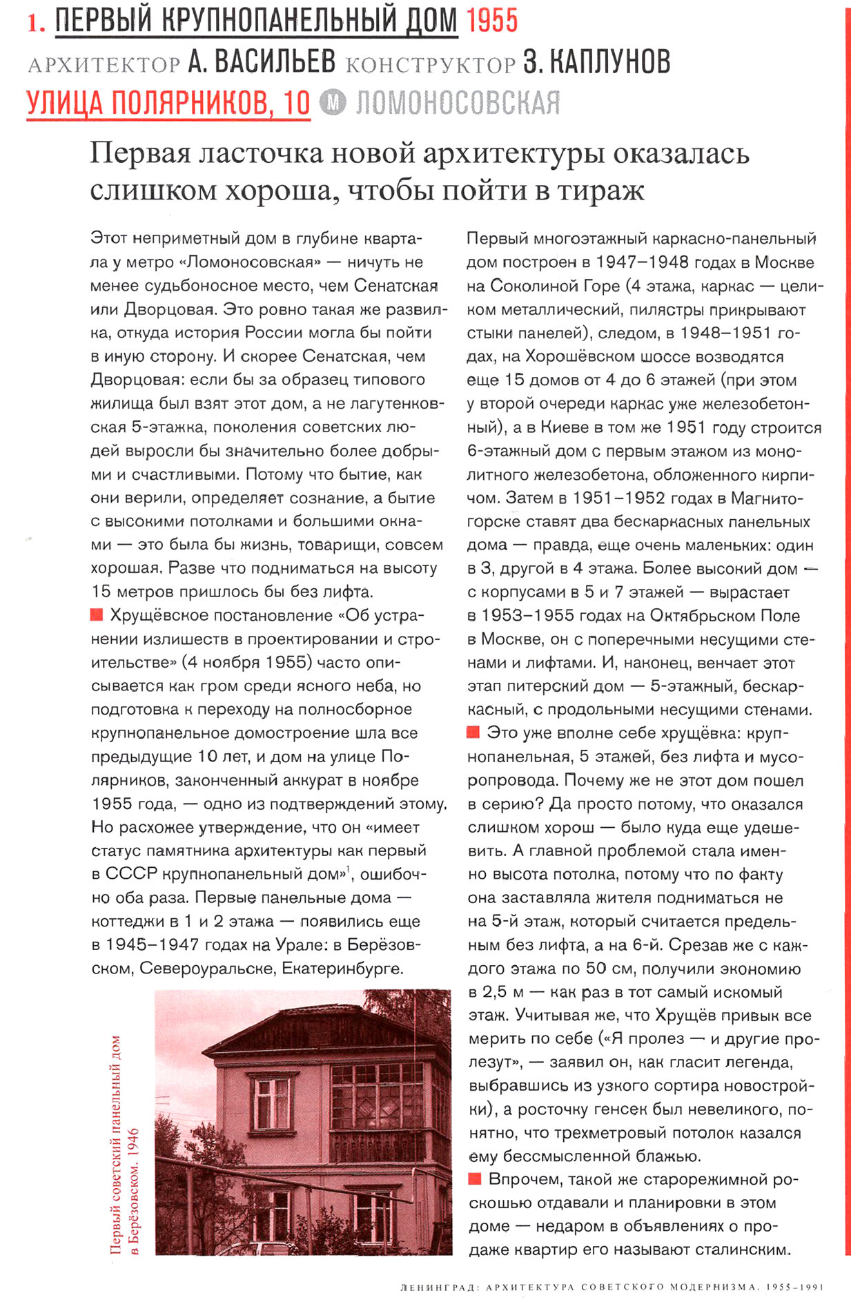 Довольно компактный формат и при этом не мини и не покет, удобно держать в руках, и довольно удобно носить с собой. Мягкая обложка из качественного плотного картона с клапанами. Оранжевый цвет как лейтмотив "Ленинграда" - на обложке, на обрезе (на блоке) и внутри по краям страниц. В книге рассматриваются 50 объектов ленинградского модернизма, от первого крупнопанельного дома 1955 г. на ул. Полярников, 10 до домов 1, 2-8 по Новосмоленской набережной. Очень жаль, что не добавили дома по Морской набережной, 19 и Капитанской ул, 5, которые построены в той же стилистике в тот же период (они тоже вписываются в эспланаду и в морской фасад!).