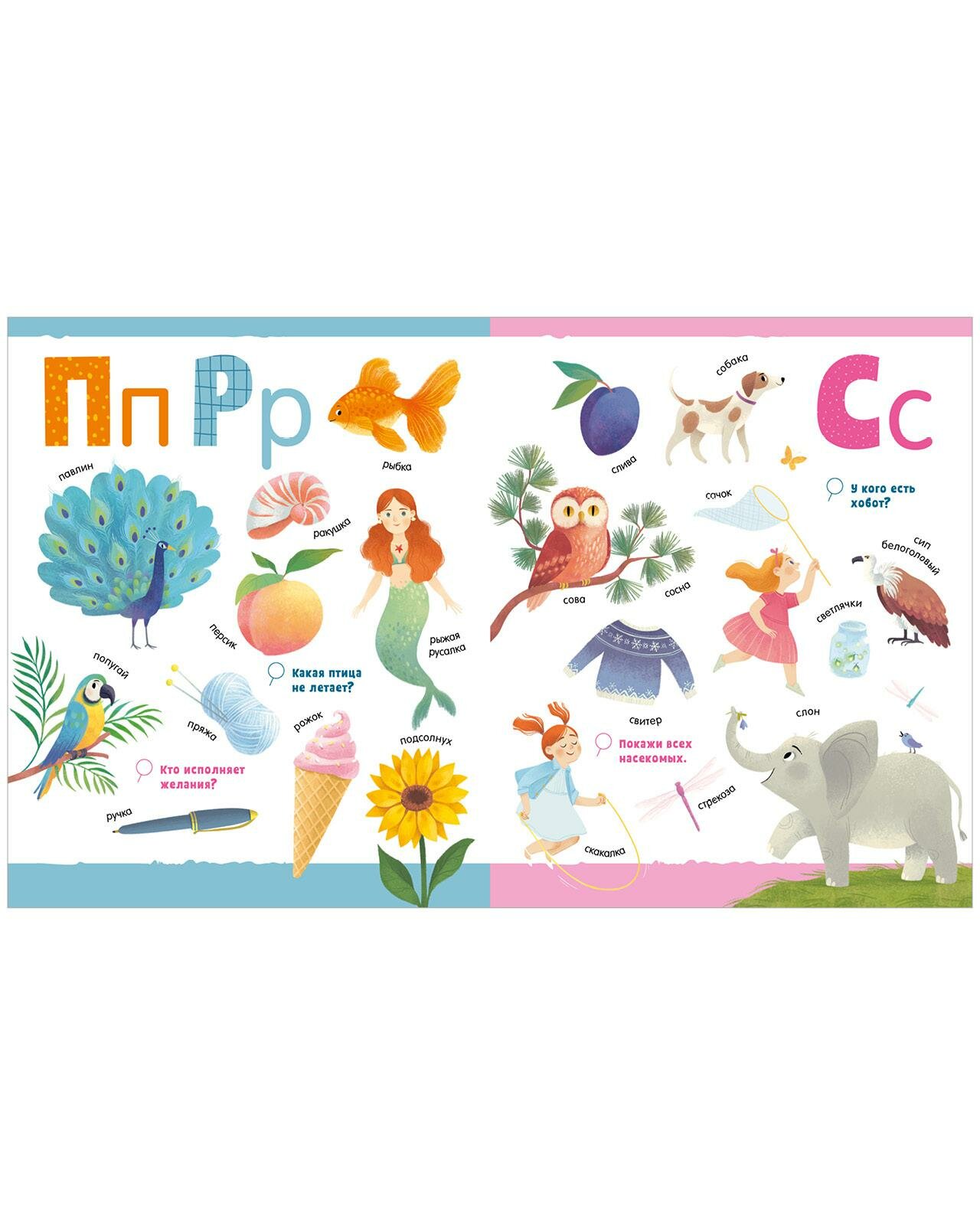 Как играть с книгой «Большая книга АБВ»? Предлагаем сначала показать ребенку букву, например «Н», затем рассмотреть все картинки на этой страничке. Прочитайте их названия, выделяя голосом в словах эту букву: нитки, ножницы, незабудки, нарцисс, носки. А затем выполните задание — покажите все цветы, которые сможете здесь найти.