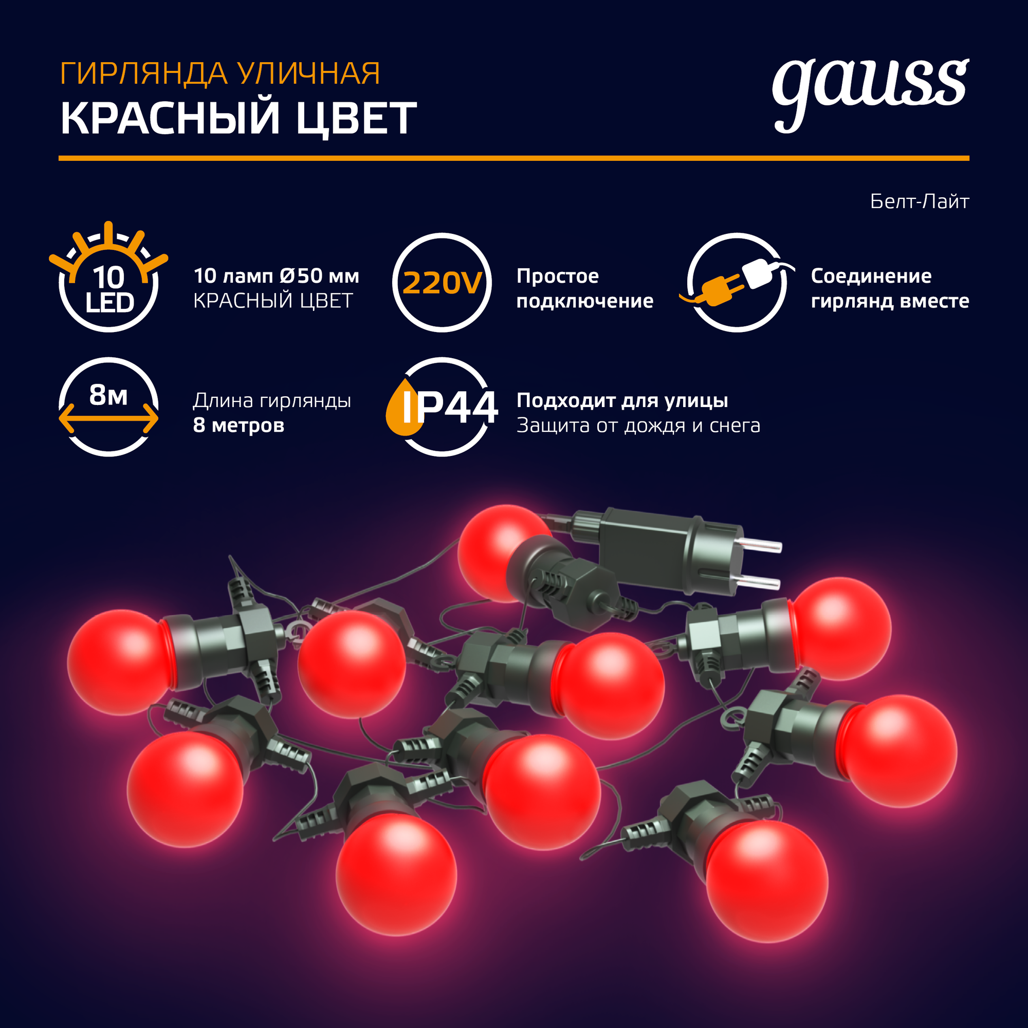 Ёлочная гирлянда Gauss Holiday Белт Лайт 10 ламп 77 м красный HL064