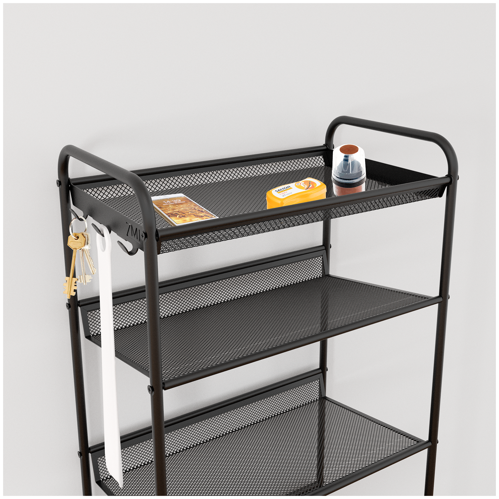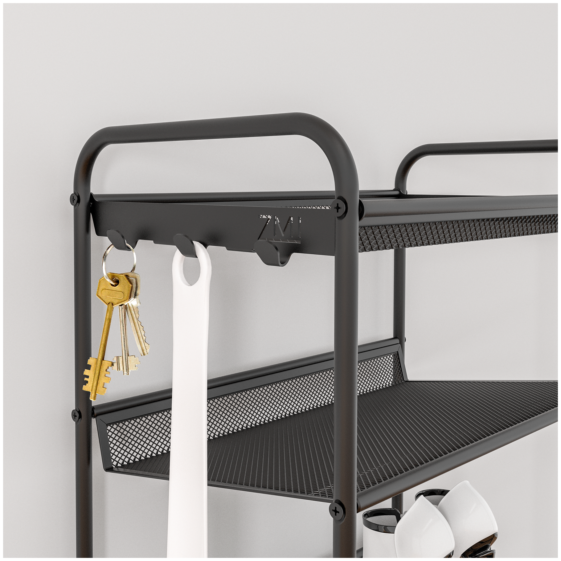 - Верхняя корзина позволяет разместить разные мелочи, а боковые крючки - ложку для обуви и ключи.