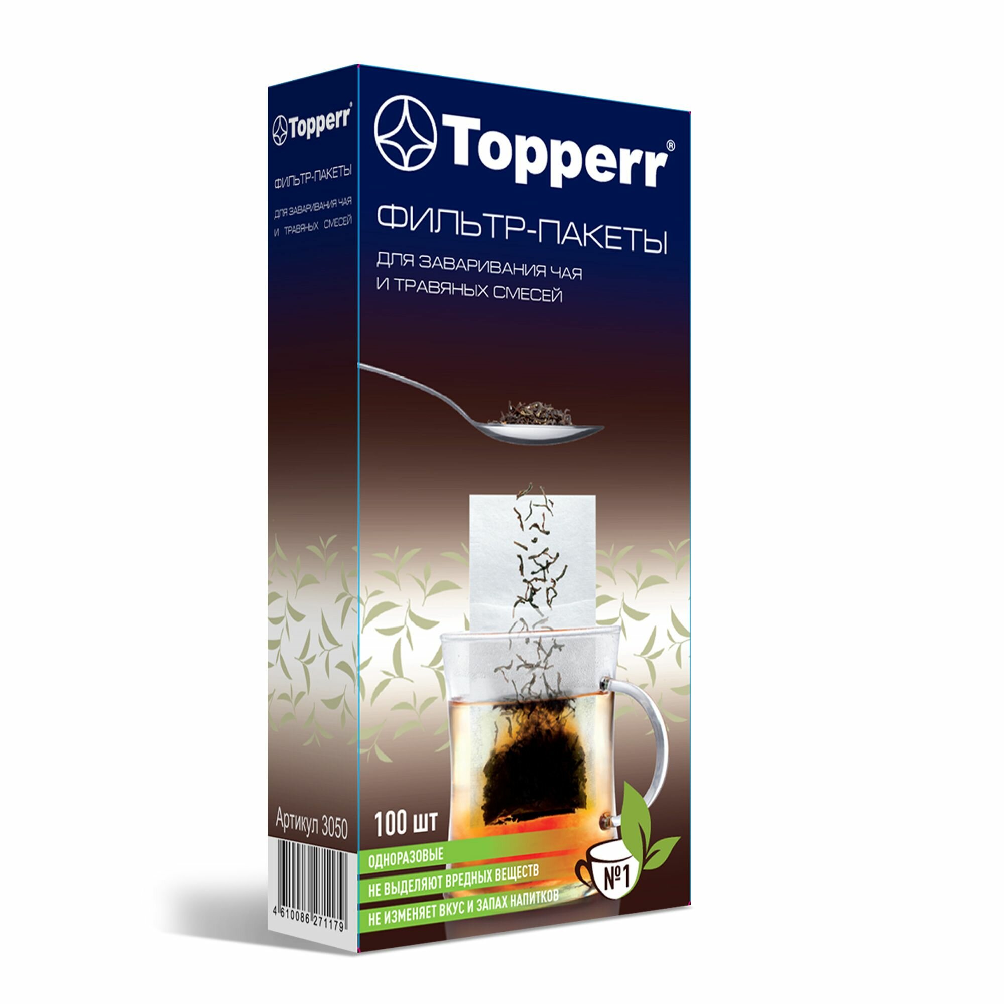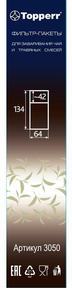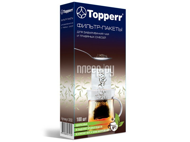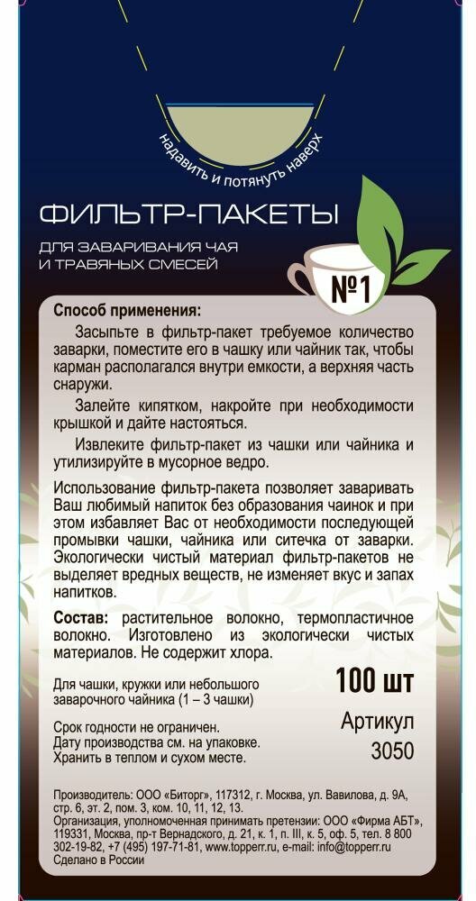 Фильтр-пакеты для заваривания чая и травяных смесей Использование фильтр-пакета позволяет заваривать Ваш любимый напиток без образования чаинок и при этом избавляет Вас от необходимости последующей промывки чашки, чайника или ситечка от заварки. Материал фильтр-пакетов не выделяет вредных веществ, не изменяет вкус и запах напитков. • одноразовые • не выделяют вредных веществ • не изменяет вкус и запах напитков Для чашки, кружки или небольшого заварочного чайника (1 – 3 чашки) Способ применения: • Засыпьте в фильтр-пакет требуемое количество заварки, поместите его в чашку или чайник так, чтобы карман располагался внутри емкости, а верхняя часть снаружи. • Залейте кипятком, накройте при необходимости крышкой и дайте настояться. • Извлеките фильтр-пакет из чашки или чайника и утилизируйте в мусорное ведро. В упаковке: 100 шт. Техническое описаниеТип: Фильтр-пакетыНазначение: для заваривания чая и травяных смесейКоличество в упаковке: 100 штКомплектацияФильтр-пакеты для заваривания чая 100 шт