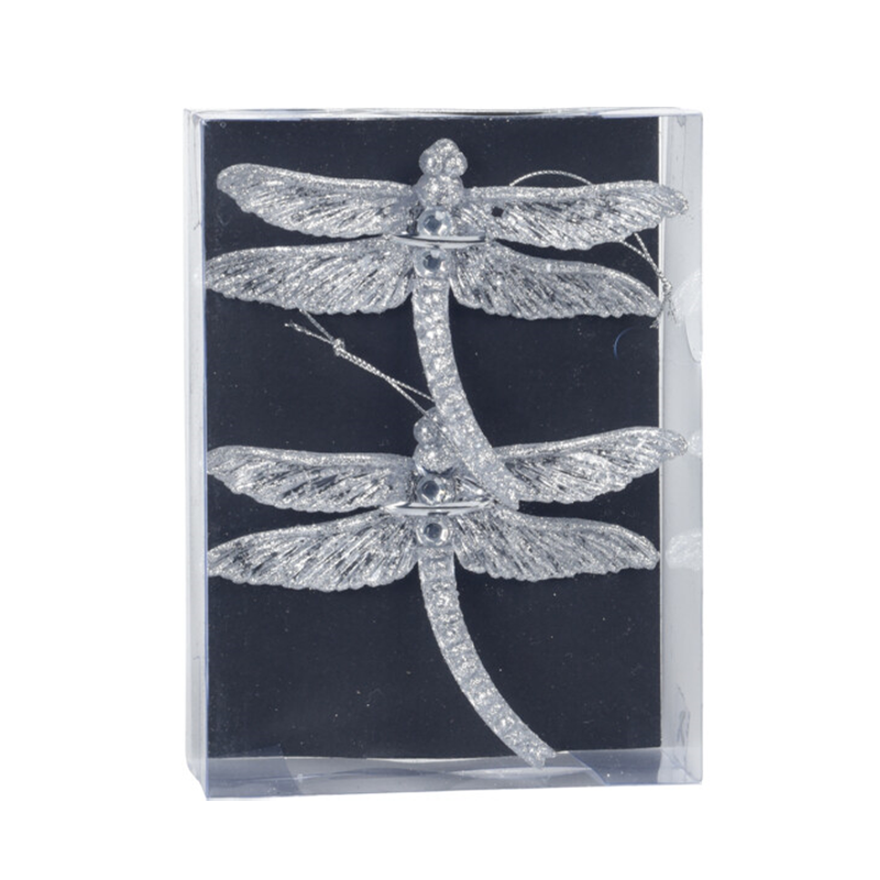 Новогодние подвески из двух стрекоз очаровывают серебристым цветом, рельефными крылышками и мерцающими стразами. Создается ощущение, что эти красавицы прилетели из сказочной рощи и теперь ищут для себя самое красивое праздничное деревце! Такие новогодние игрушки станут элегантным декором для средней и большой ели.