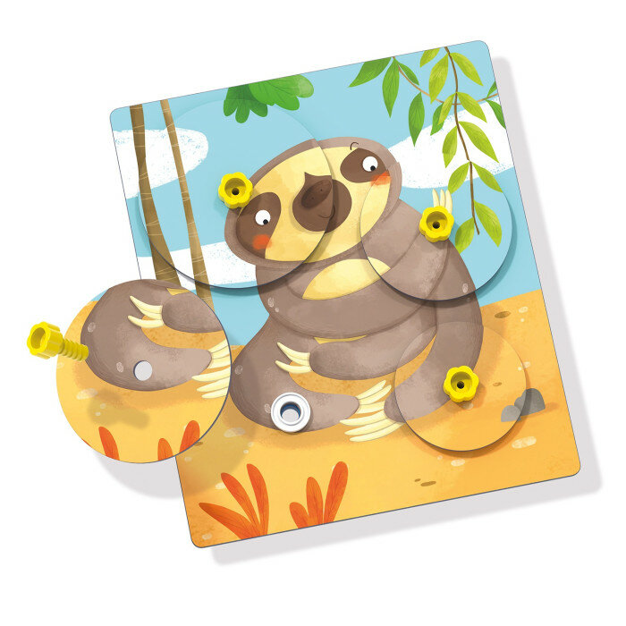 Мозаика с вращающимися дисками, которая подходит для детей обучающихся по известной и популярной системе Монтесорри. Задача малыша вкрутить с помощью маленького болтика диск в пазл в нужном месте и повернуть таким образом диск, чтобы картинка сложилась в целый рисунок.