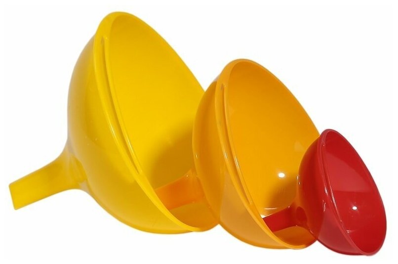 Набор включает три воронки диаметром 7,5, 11,5 и 14см. Благодаря конструкции воронки устойчивы в процессе переливания. Оснащены отверстием для удобного хранения в подвешенном состоянии.