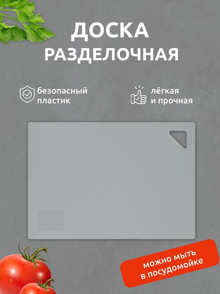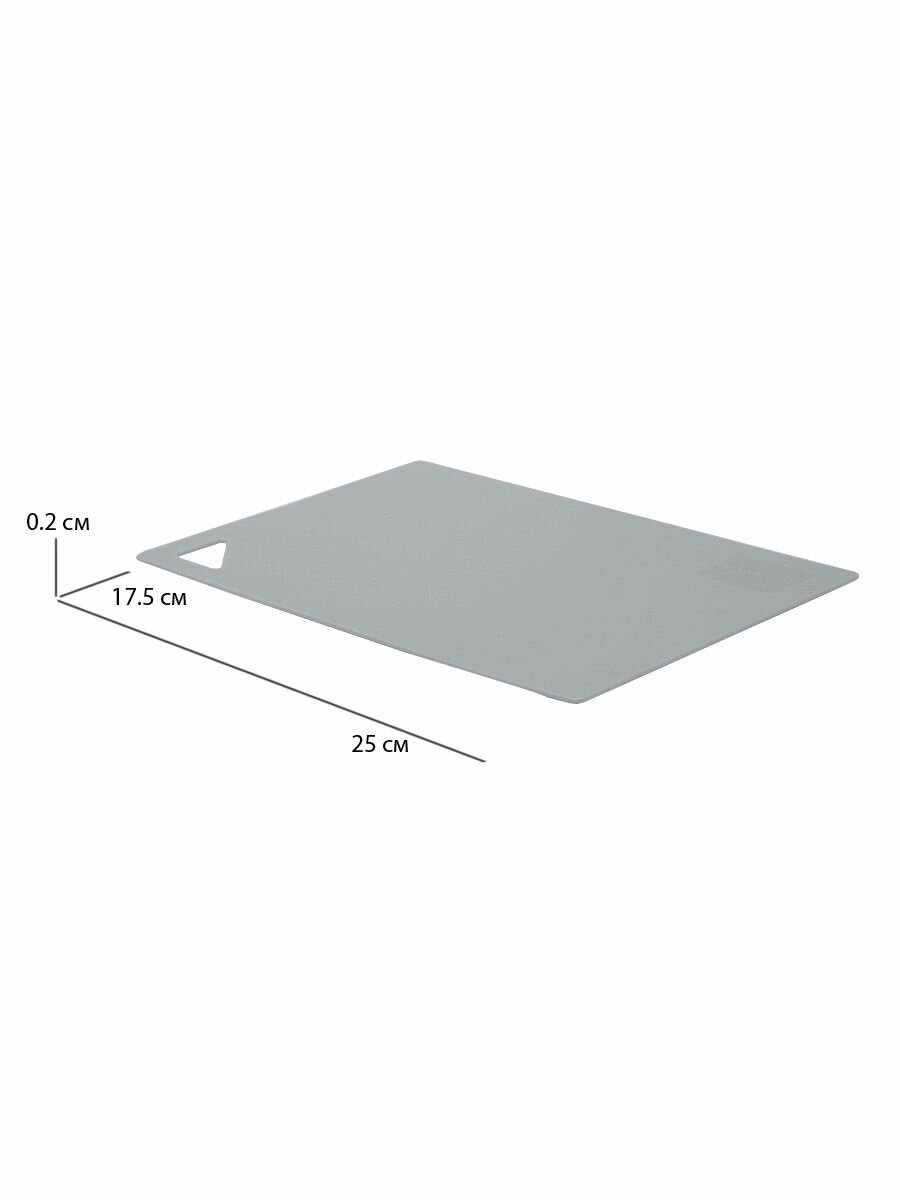 Разделочная доска - незаменимый аксессуар на любой кухне. Использование современной гибкой доски значительно облегчает процесс приготовления пищи, поскольку эту доску можно легко согнуть и перенести нарезанные продукты в кастрюлю или салатник, не рассыпав содержимое. Благодаря мягкости материала нож не тупится. На доске имеется отверстие для удобного захвата и хранения в подвешенном состоянии. Изделие безопасно и химически нейтрально. Доска гибкая имеет противоскользящую матовую поверхность, которая легко о
