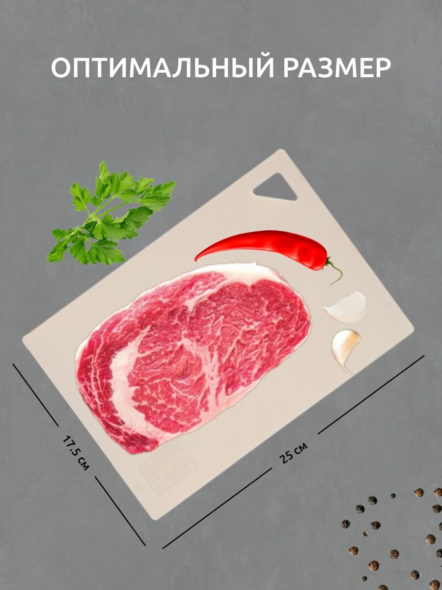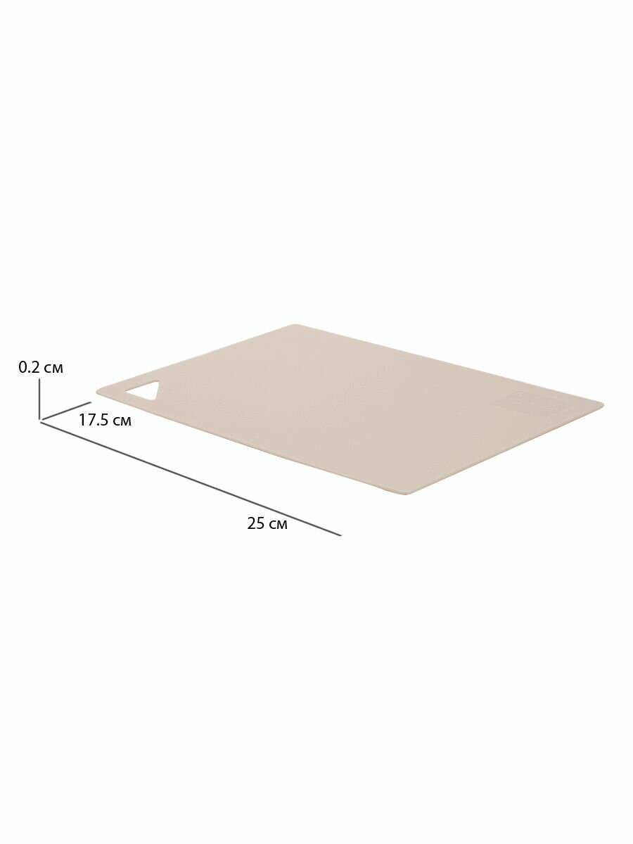 Разделочная доска - незаменимый аксессуар на любой кухне. Использование современной гибкой доски значительно облегчает процесс приготовления пищи, поскольку эту доску можно легко согнуть и перенести нарезанные продукты в кастрюлю или салатник, не рассыпав содержимое. Благодаря мягкости материала нож не тупится. На доске имеется отверстие для удобного захвата и хранения в подвешенном состоянии. Изделие безопасно и химически нейтрально. Доска гибкая имеет противоскользящую матовую поверхность, которая легко о