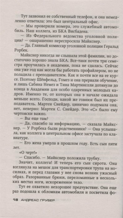 Это первый роман из очередной трилогии о Немец и Снейдере, и , к сожалению, Сабины было очень много и представил ее автор во всей красе: упертая, с невероятным самомнением и уверенностью в своей непогрешимости в борьбе с преступниками, раздражающе любопытна. На ее фоне Снейдер выглядит белым и пушистым. А в остальном -это очень хороший детектив, с интересным сюжетом, читается он очень быстро, нигде не затянут.
