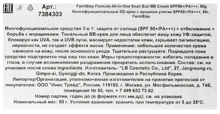 | Полное наименование | BB крем для лица FarmStay восстанавливающий с муцином улитки 50 мл |