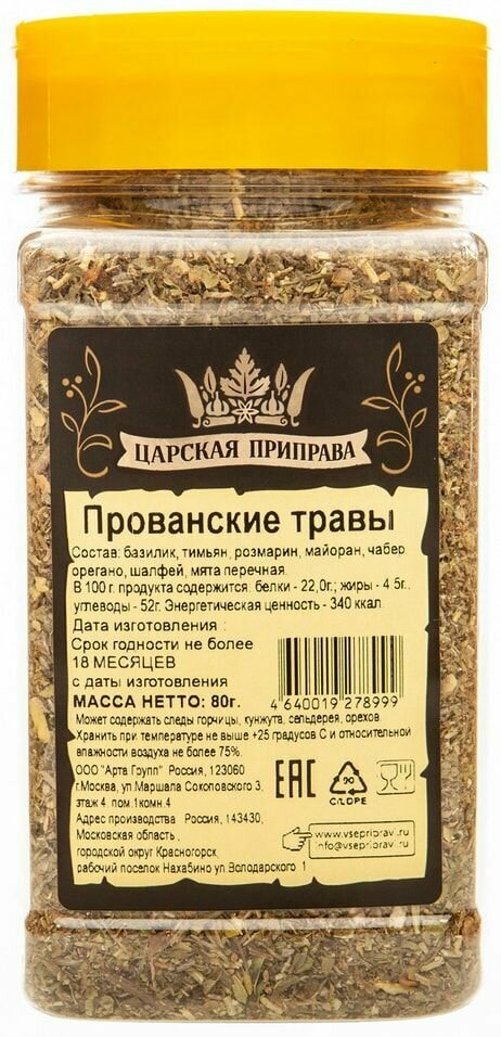 | Состав | Базилик сушеный, майоран сушеный, розмарин сушеный, шалфей сушеный, орегано сушеный, чабер сушеный, тимьян сушеный, мята перечная сушеная |