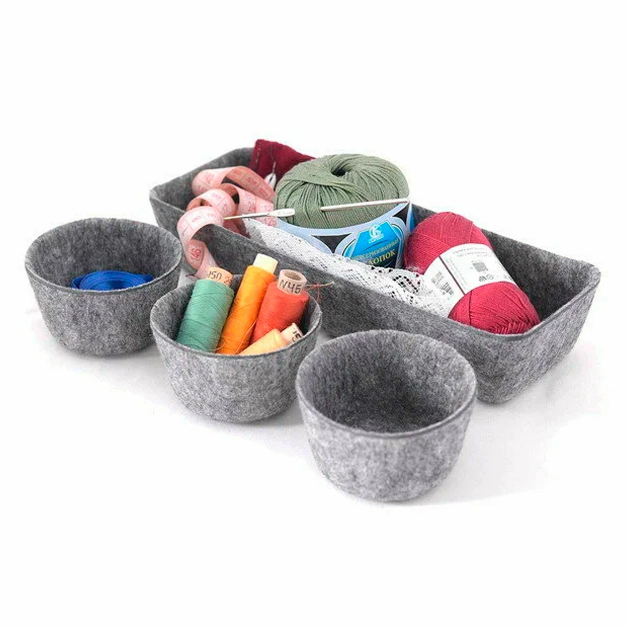 Органайзер предназначен для хранения канцелярских принадлежностей, косметики, ремней, изделий для рукоделия, кухонных принадлежностей, а также других предметов домашнего обихода и аксессуаров. Органайзер поможет организовать пространство. Положите его в выдвижной ящик шкафа, комода, тумбы или поставьте на полку или стол и нужные предметы всегда будут под рукой. Все четыре элемента органайзера можно использовать как вместе, так и по отдельности. Органайзер изготовлен из прочного нетканого материала, путем валяния синтетических волокон. Состав: 100% полиэстер. Размеры 27х9х5см, 8,5х5см.