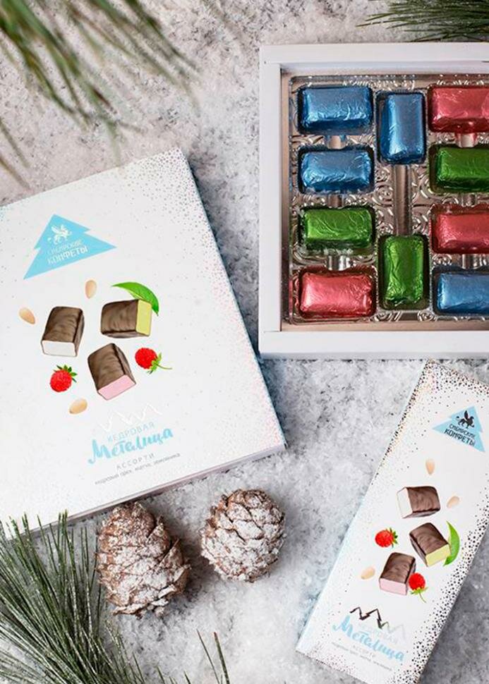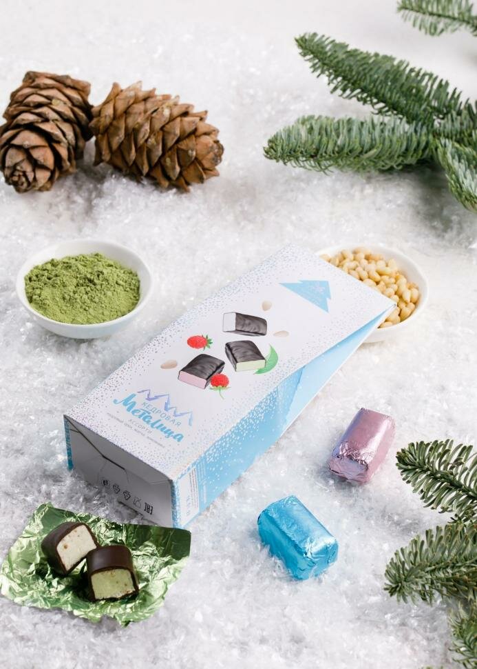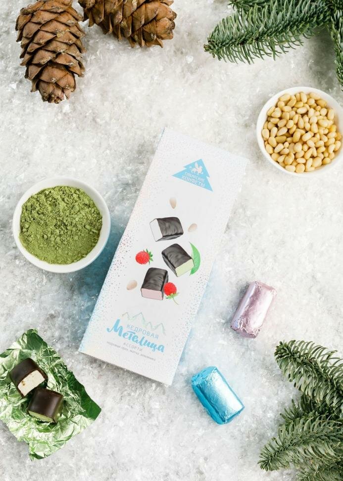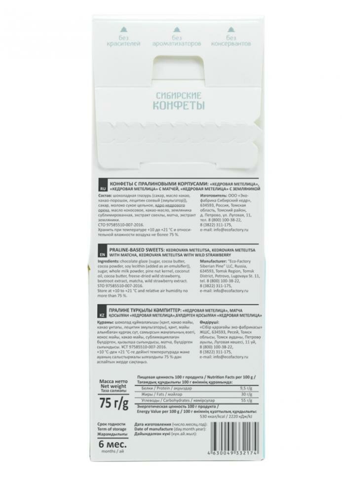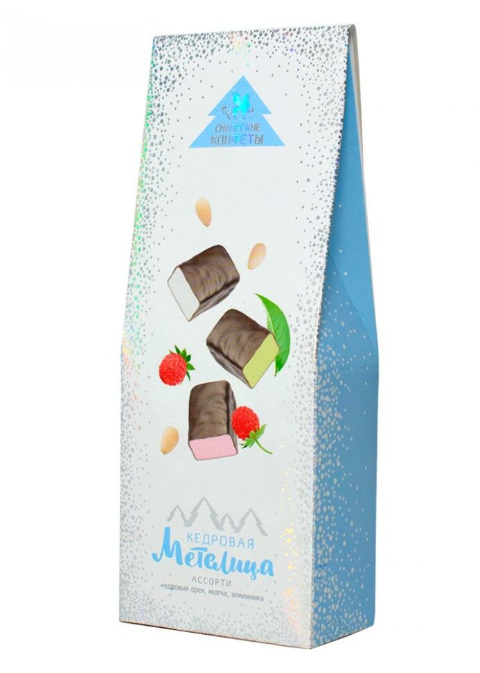Кедровая Метелица 75 гр, ассорти Кедровая метелица - это нежное молочное пралине с добавлением кедрового ореха, лесной земляники и японского чая матча, покрытое шоколадной глазурью. Состав: Шоколадная глазурь ( сахар, масло какао, какао-порошок, лецитин соевый (эмульгатор), сахар, молоко сухое цельное, ядро кедрового ореха, масло кокосовое, эквивалент какао-масла, земляника сублимированная, экстракт свеклы, матча экстракт земляники Срок годности: 6 месяцев Упаковка: картонная коробка крафт Вес: 75 гр.