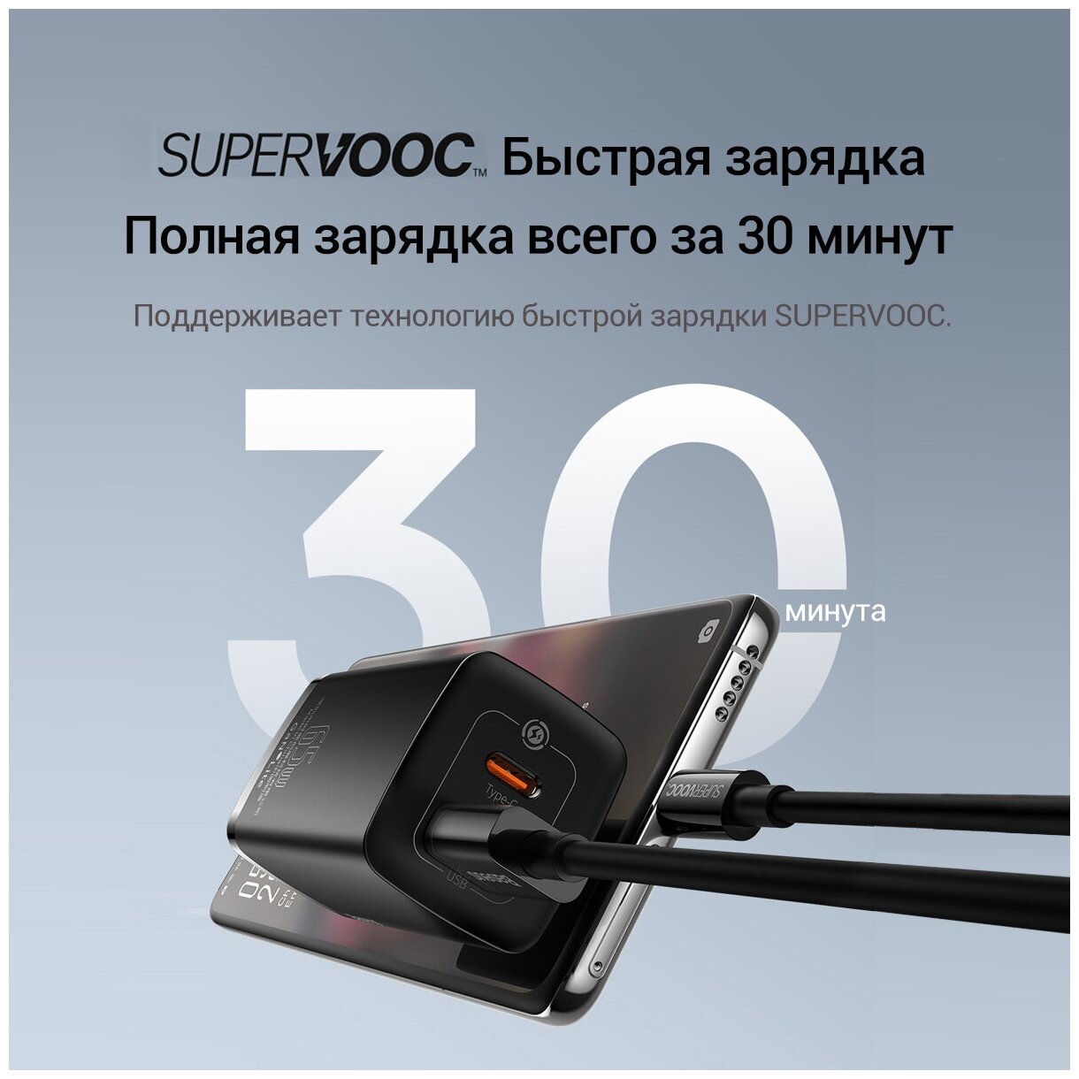 Поддерживает все типы зарядок с суммарной мощностью до 65W. Имеет два разъема подключения: USB-A и Type-C. При использовании необходимо учитывать, что через разъем USB-A можно получить максимум 45W, а через Type-C - 65W. Поэтому, если вам нужно заряжать телефон на максимальной мощности, то к данному сетевому зарядному устройству нужно приобретать кабель Type-C -> Type-C.