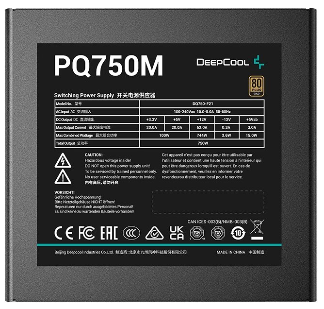 | Прочие особенности и свойства | Блок питания DEEPCOOL PQ750M [R-PQ750M-FA0B-EU] мощностью 750 Вт имеет полностью модульную конструкцию. Он оснащен гидродинамическим подшипником, который существенно уменьшает трение и вибрацию внутри корпуса. Этим обеспечена надежность и бесшумная работа. Использовать представленный БП можно с офисными и игровыми моделями ПК.,Для эффективного охлаждения вентилятор устройства оснащен кнопкой на обратной стороне корпуса. Это значит, что владелец компьютера может сам управлять им, включая и выключая по мере необходимости. Наработка на отказ для блока питания DEEPCOOL PQ750M [R-PQ750M-FA0B-EU] достигает 100 000 часов. |
