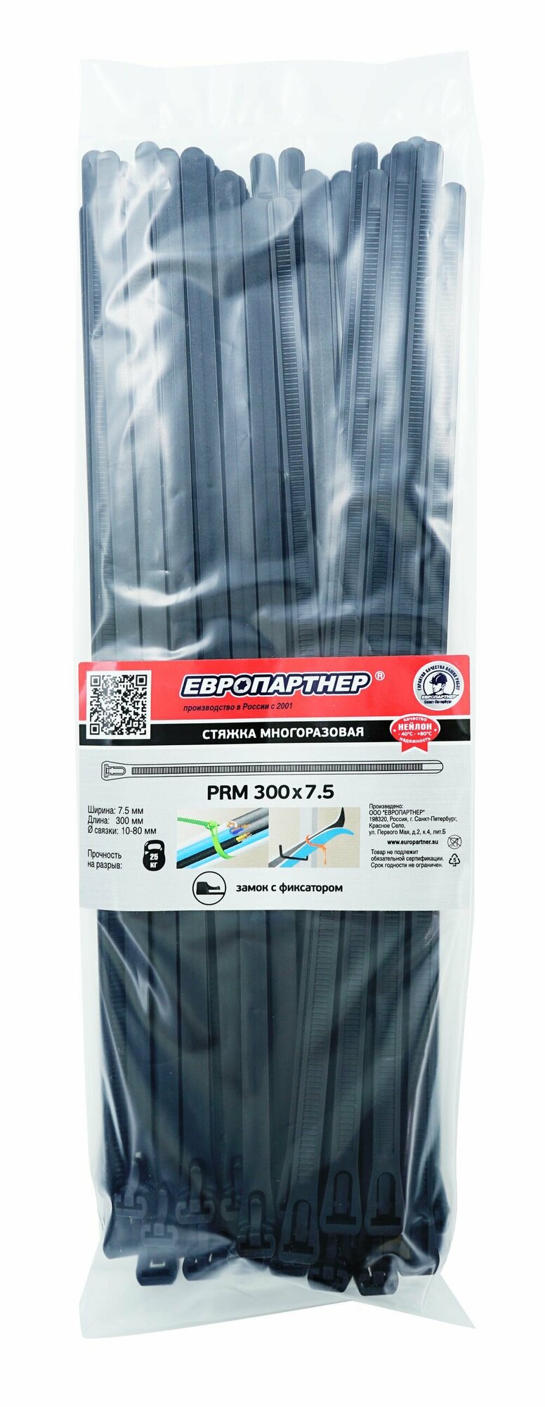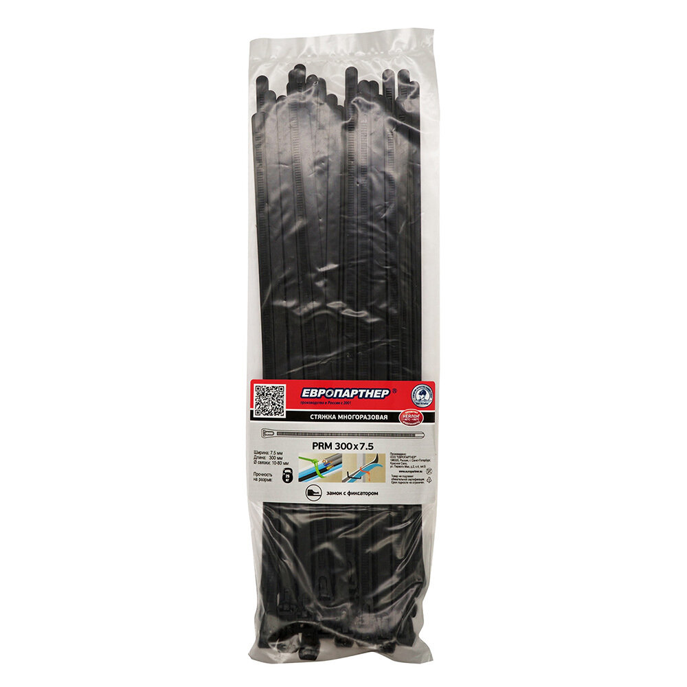 Стяжка многоразовая нейлоновая PRM 75х300мм черная (50шт.) Европартнер