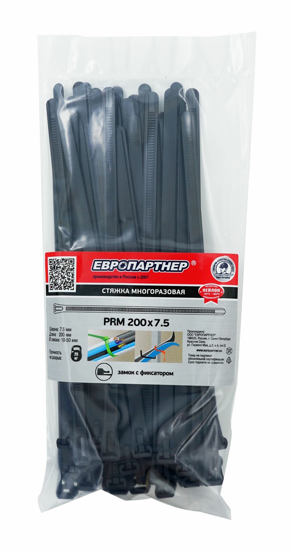 Стяжка многоразовая нейлоновая PRM 75х200мм черная (50шт.) Европартнер
