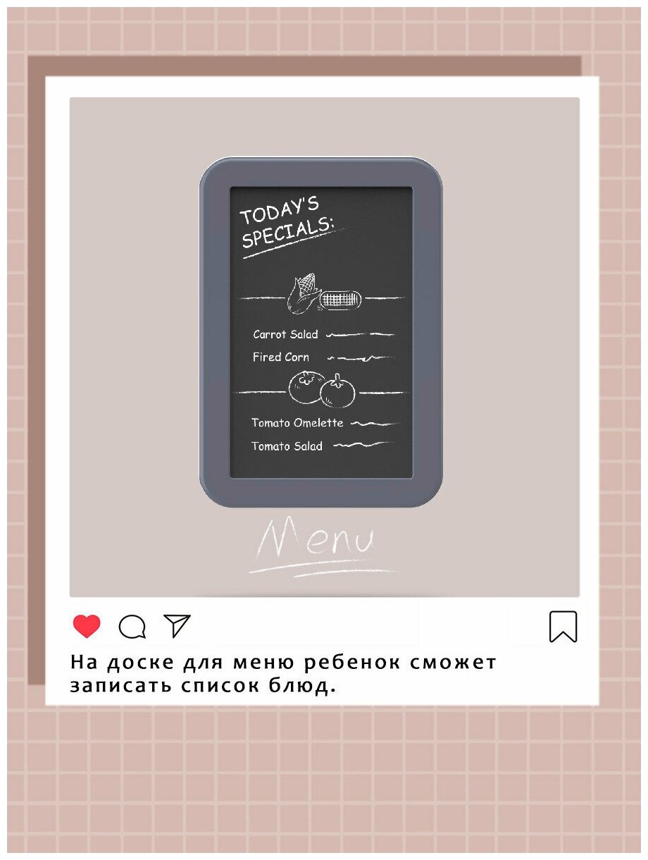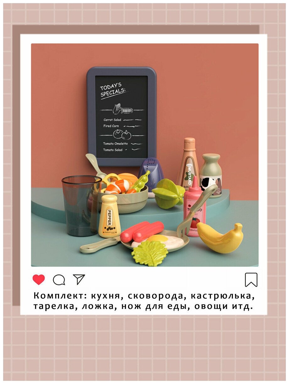 В комплект входит кухонная стойка, сковорода, кастрюлька, тарелка, ложка, нож для еды, овощи и т.д.