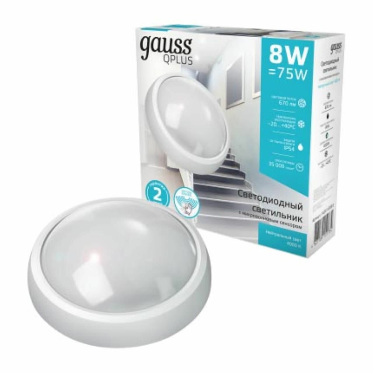 Светильник Gauss Qplus круглый LED 8W 670lm 4000K с микроволновым сенсором 175х76 мм
