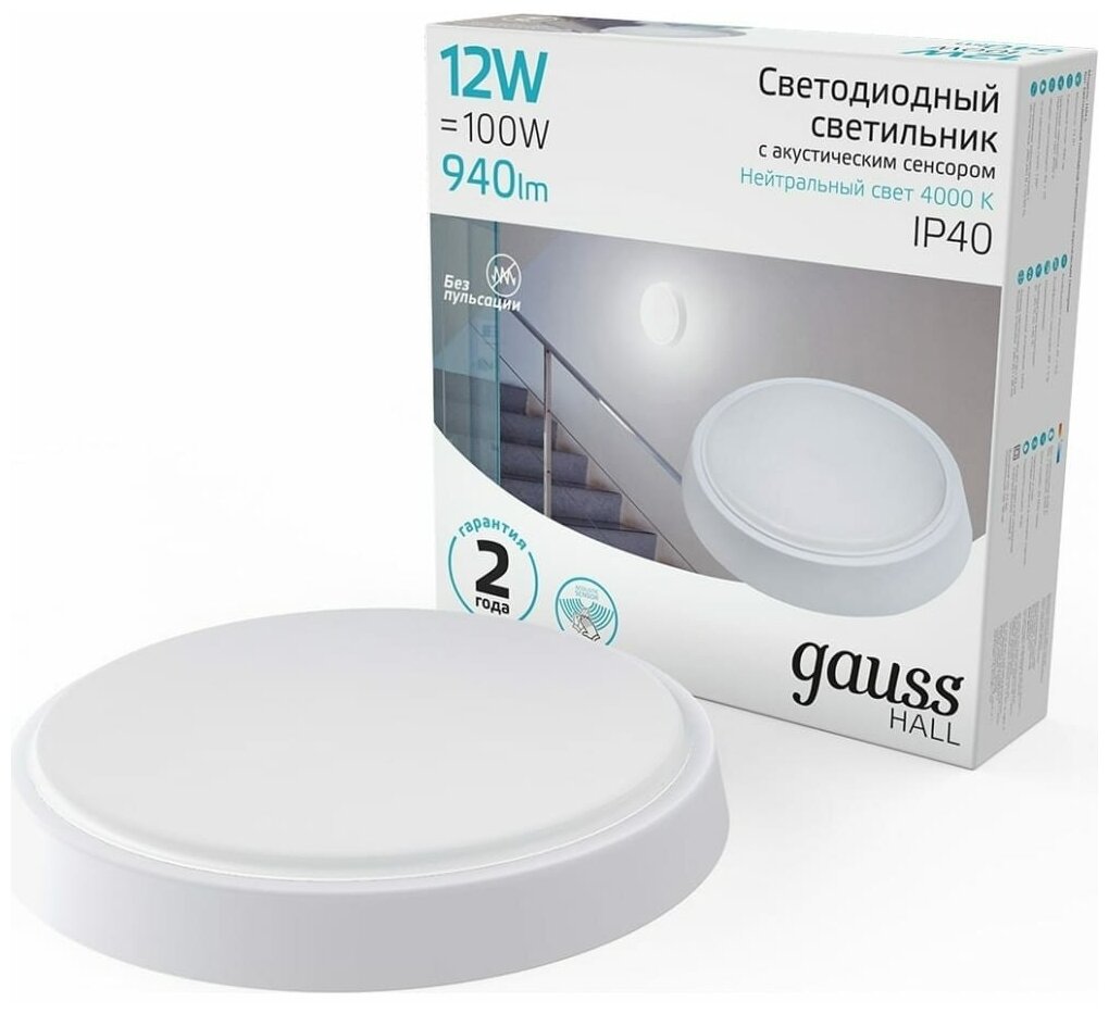 Светильник Gauss Hall круглый LED 12W 940lm 4000K с оптико-акустическим сенсором 135х33 мм