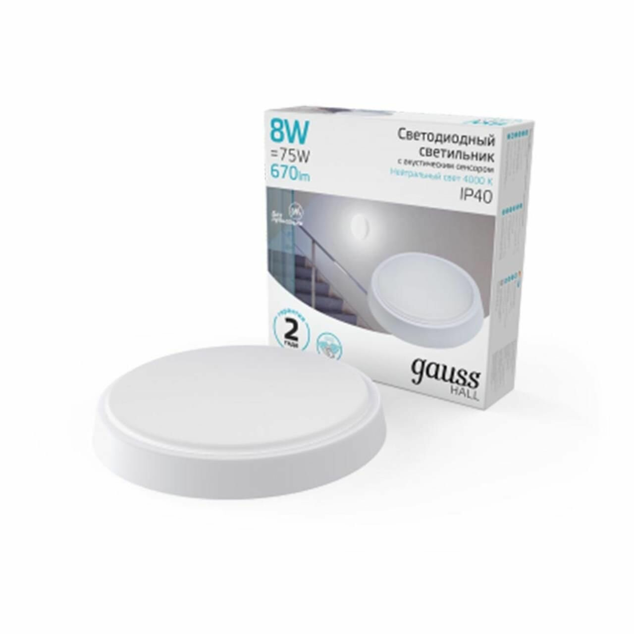 Светильник Gauss Hall круглый с оптико-акустическим сенсором 8W 670lm 4000K 135х33 мм