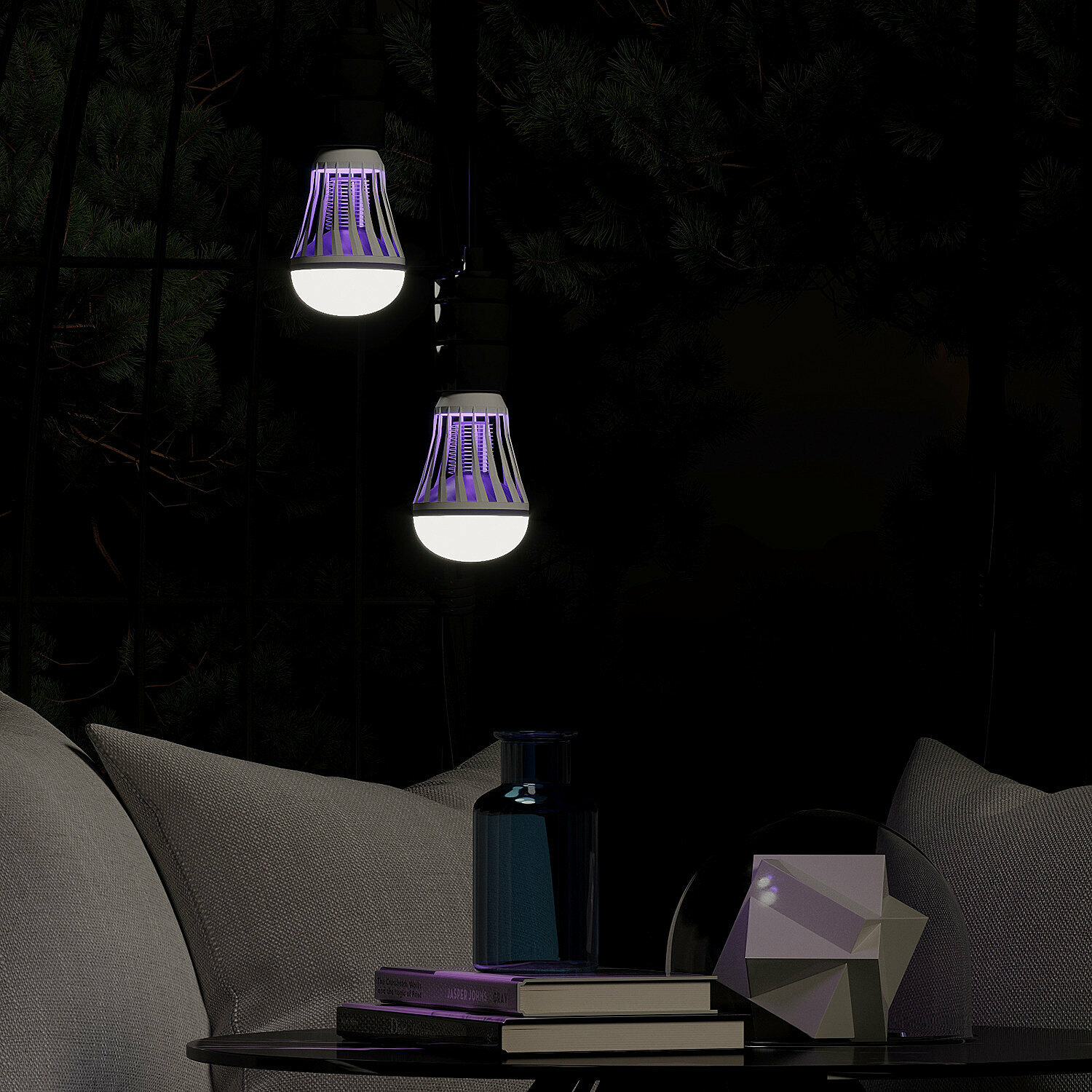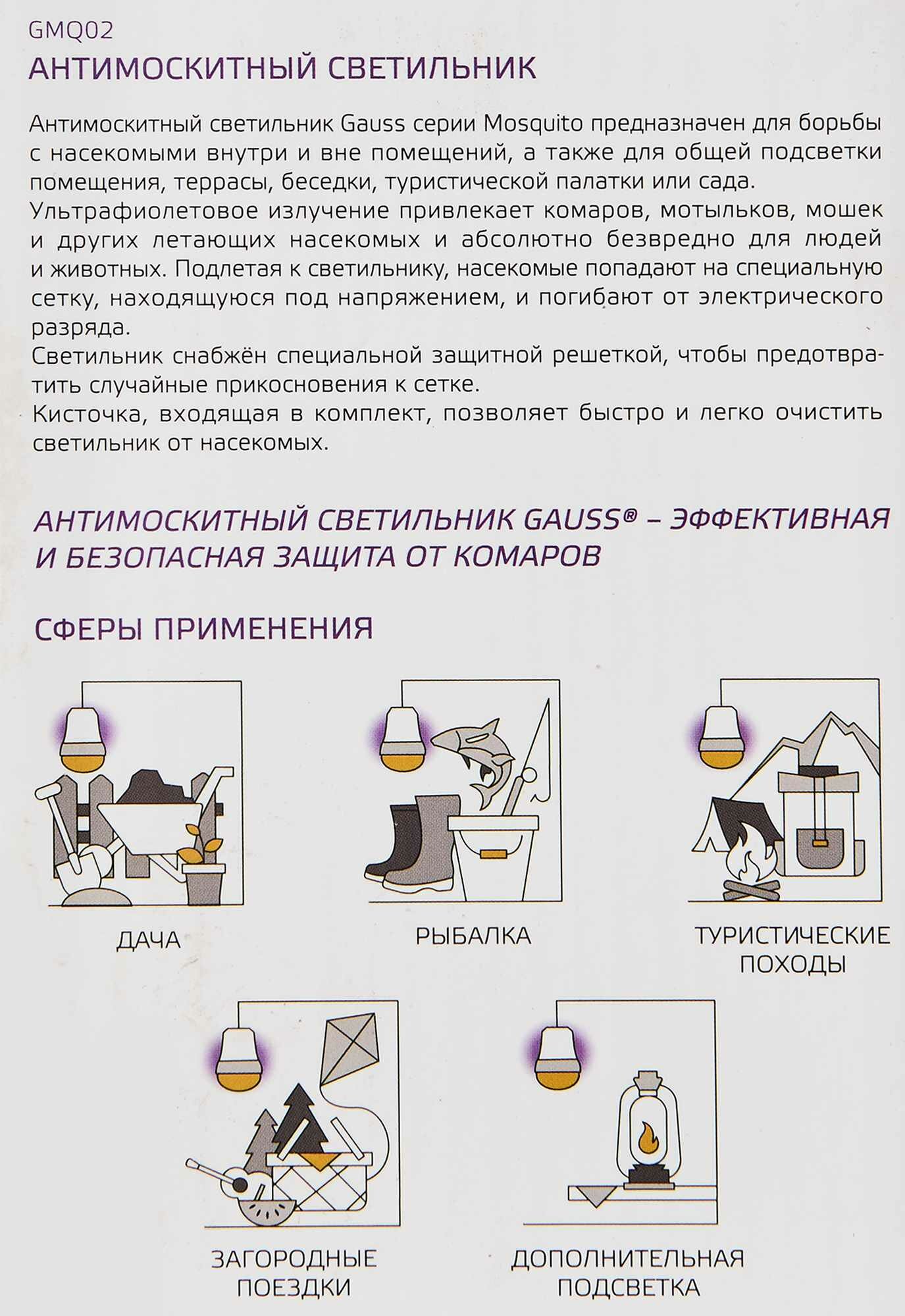 Светильники имеют 3 режима работы: режим защиты от насекомых с ультрафиолетовым излучением, общий режим свечения с цветовой температурой 3500К и комбинированный режим с подсветкой и защитой от насекомых. Ультрафиолет притягивает комаров, мотыльков и других летающих насекомых, а за счет напряжения исходящего от светильника при соприкосновении со стенкой они погибают. Кисточка, предоставляемая в комплекте, позволяет быстро и легко очистить светильник от насекомых.