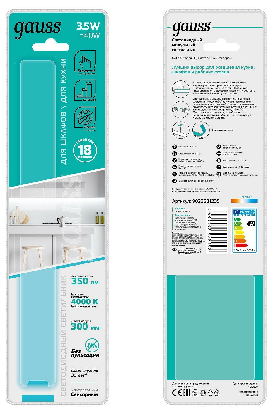 Особенностью светильников от Gauss является возможность последовательного соединения в линейку нескольких светильников с помощью коннекторов и простая установка – достаточно их приклеить к поверхности с помощью двухстороннего скотча или прикрепить его с помощью металлических скоб. Набор установочных креплений для двух вариантов монтажа входят в комплектацию данного изделия.