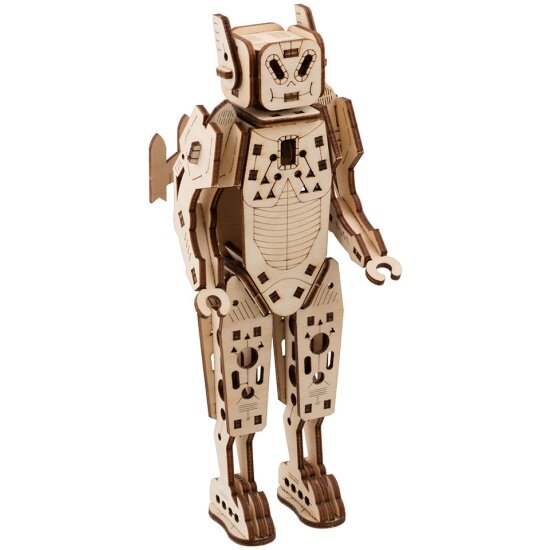 В каждый набор входит пошаговая инструкция на русском языке. Пазлы представляют собой небольшие сборные 3D модели из плоских фанерных деталей. Толщина фанеры 3 мм. Для сборки моделей не требуется клей или клеевые материалы. Детали пазлов фиксируются между собой с помощью пазов. Рекомендуемый возраст от пяти лет. Самая любимая игрушка - это та, которая сделана своими руками. А самое главное, что элементы моделей подвижны. Соберите всю коллекцию роботов!