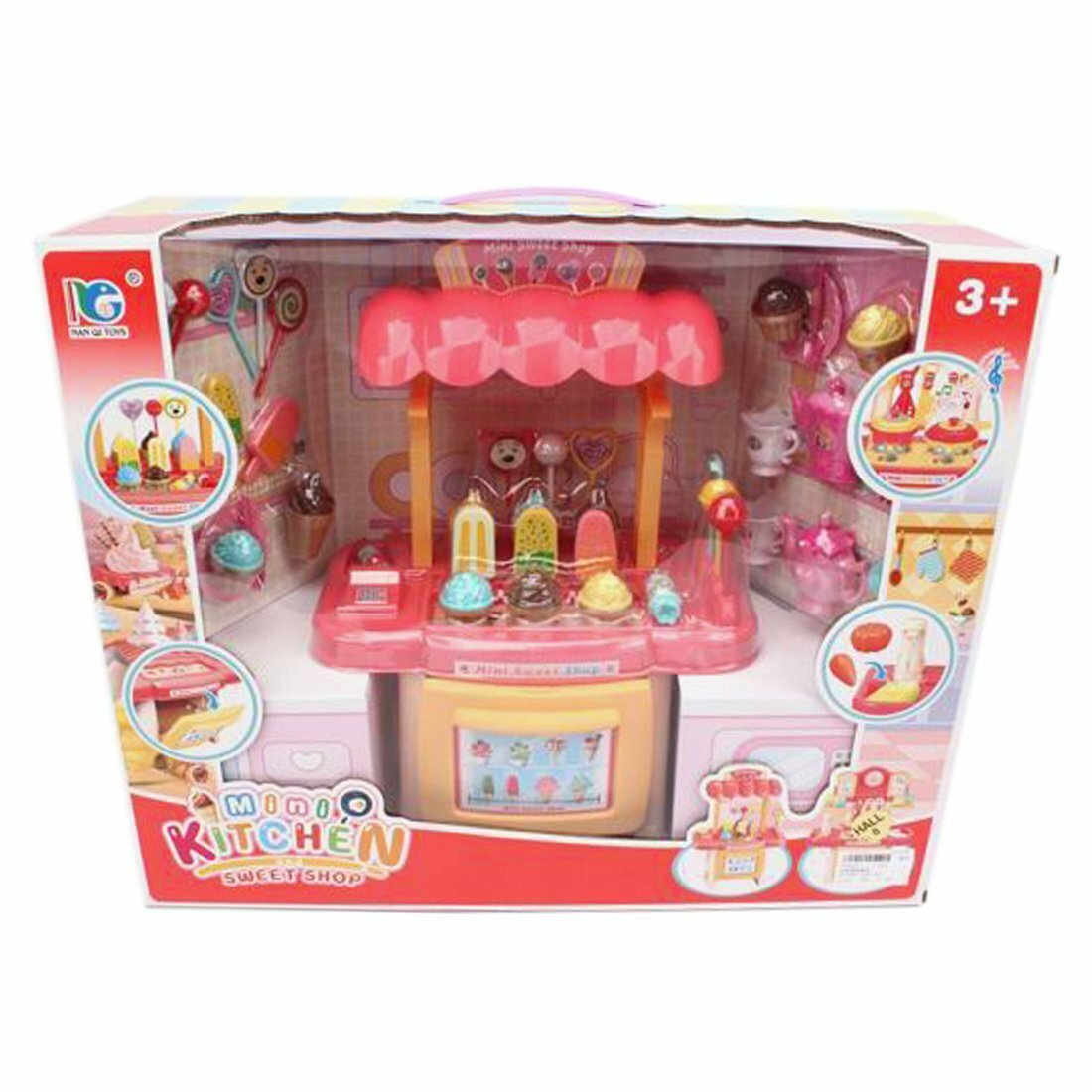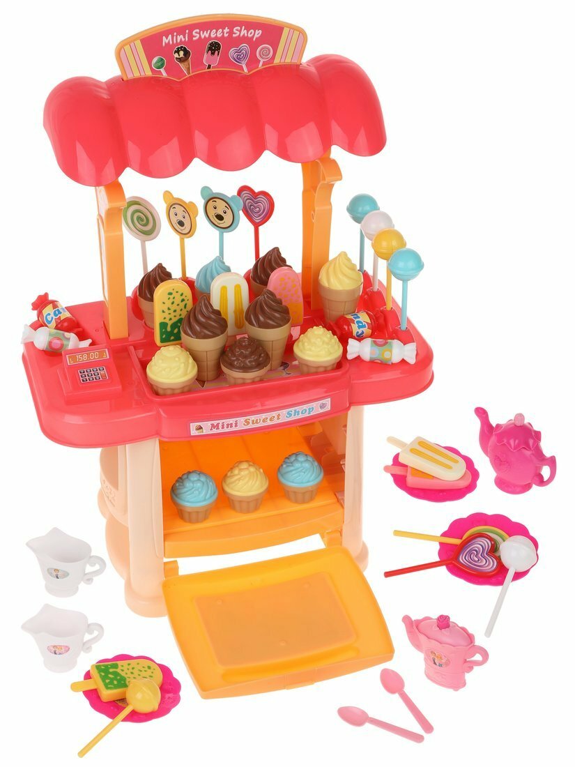 В набор входит: прилавок магазина и множество аксессуаров для реалистичной игры (вафельные стаканчики с мороженым, леденцы на палочках, тарелочки, ложки, чашки, чайники, конфетки, а также калькулятор-муляж, расположенный на панели прилавка). Всего – 45 предметов для веселой игры!