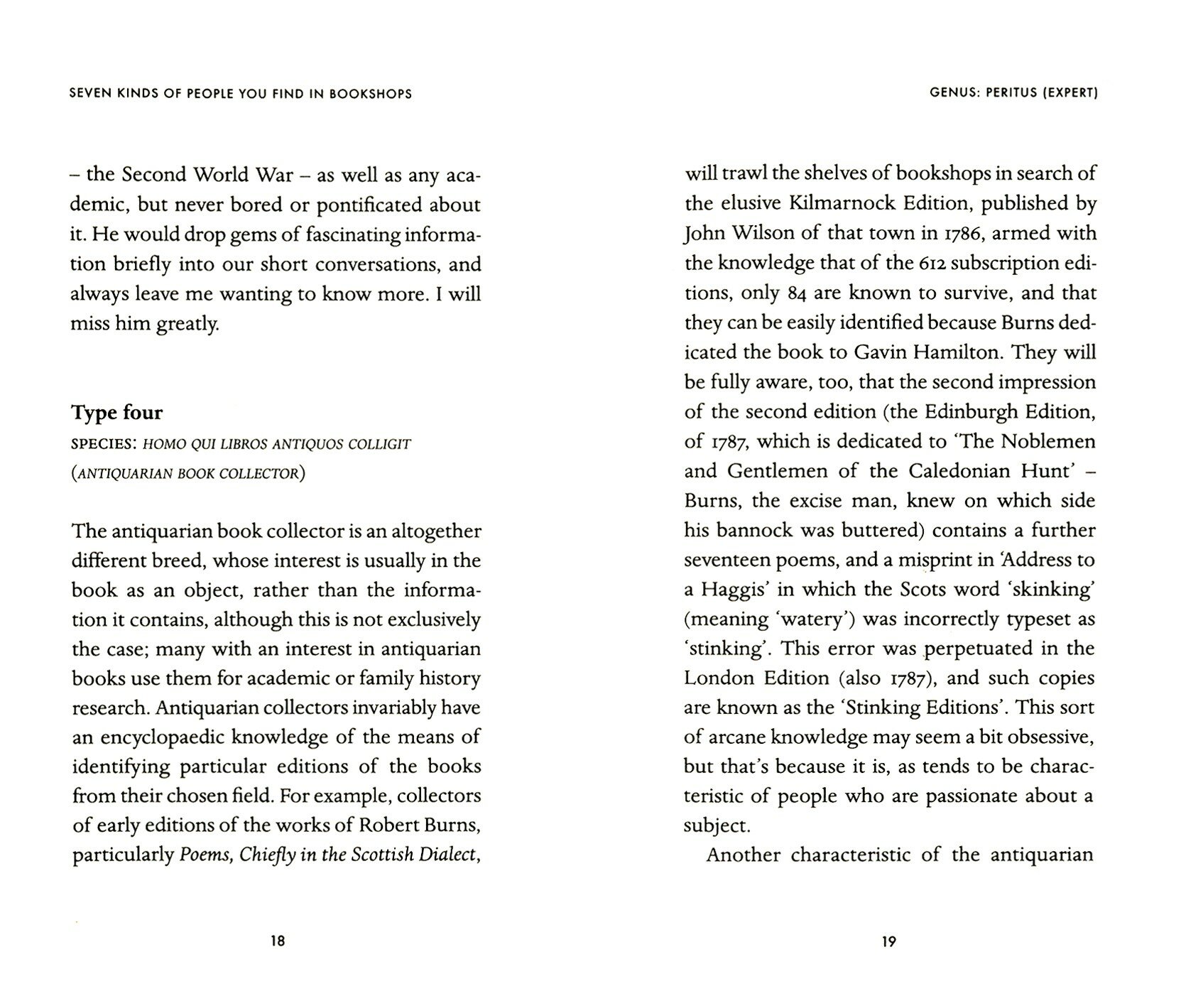 In Seven Kinds of People You Find in Bookshops he distils the essence of his experience into a warm, witty and quirky taxonomy of the book-loving public. So, step inside to meet the crafty Antiquarian, the shy and retiring Erotica Browser and gormless yet strangely likeable shop assistant Student Hugo - along with much loved bookseller favourites like the passionate Sci-Fi Fan, the voracious Railway Collector and the ever-elusive Perfect Customer.