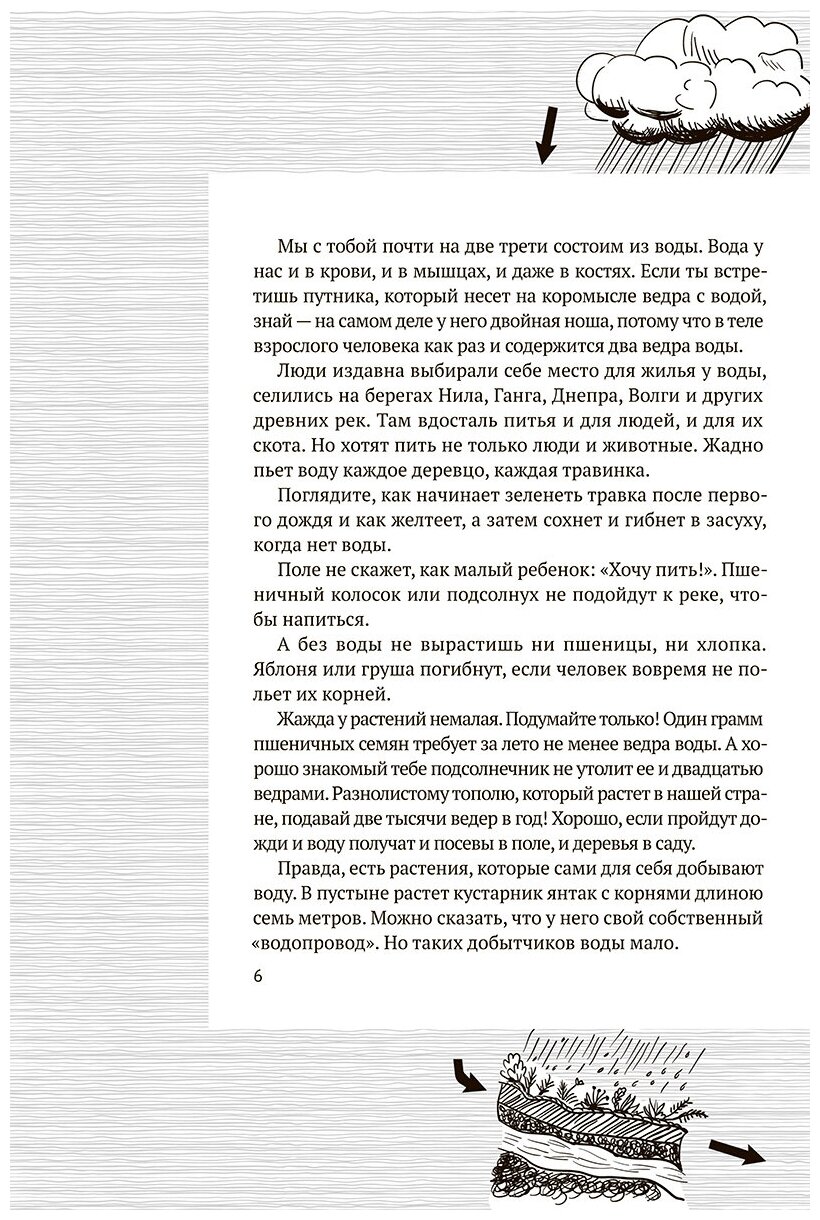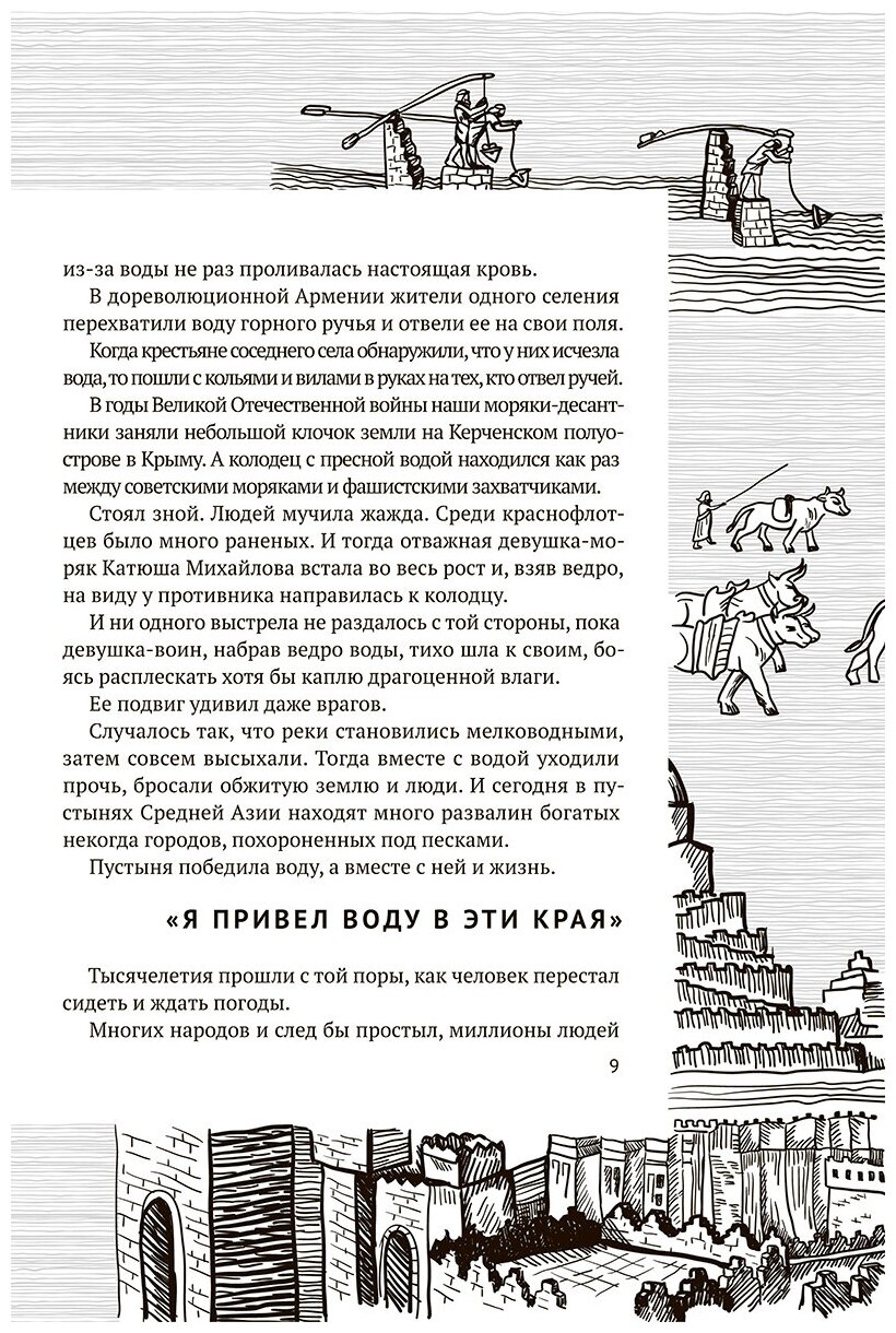 Вода окружает нас повсюду: закипает в чайнике, течет из-под крана, приводит в движение паровоз, бежит в реке, льется с неба дождем или сыплется снегом. Но что мы знаем о воде? Почему ни растение, ни животное, ни человек не могут прожить без нее? Можно ли ей управлять и как люди делали это в прошлом и продолжают делать сейчас? А как с помощью воды лечат разные болезни и укрепляют здоровье? Благодаря этой книге ваш ребенок изучит главные свойства этого уникального вещества, а также научится беречь и ценить его. Это увлекательное изложение истории воды: о том, как ее использовали в прошлом и продолжают применять сейчас в самых разных сферах: от производства техники до многокилометровых путешествий. Книга написана просто и интересно, понравится детям, интересующимся наукой, а также их родите