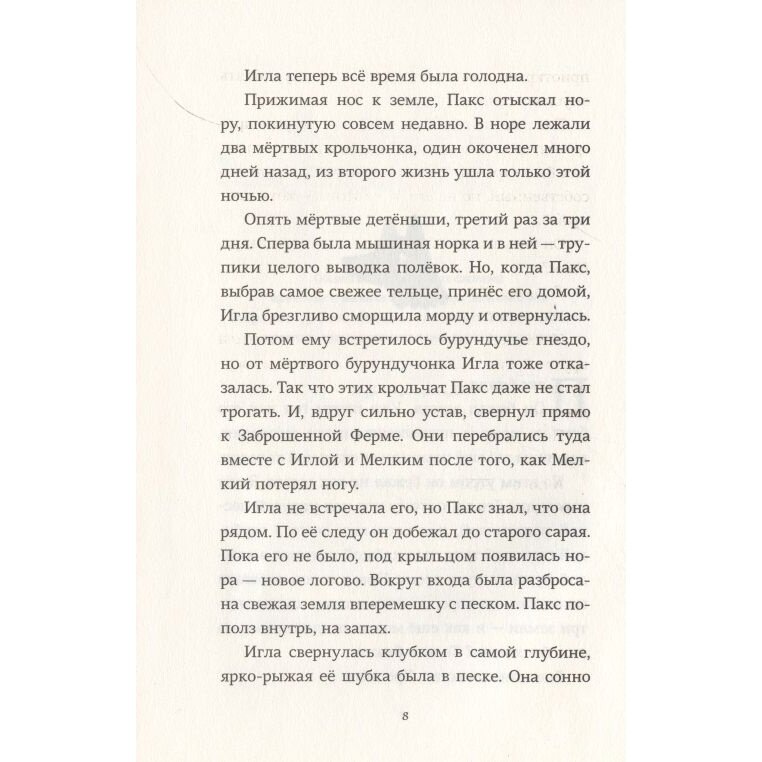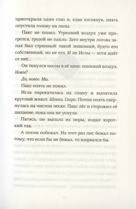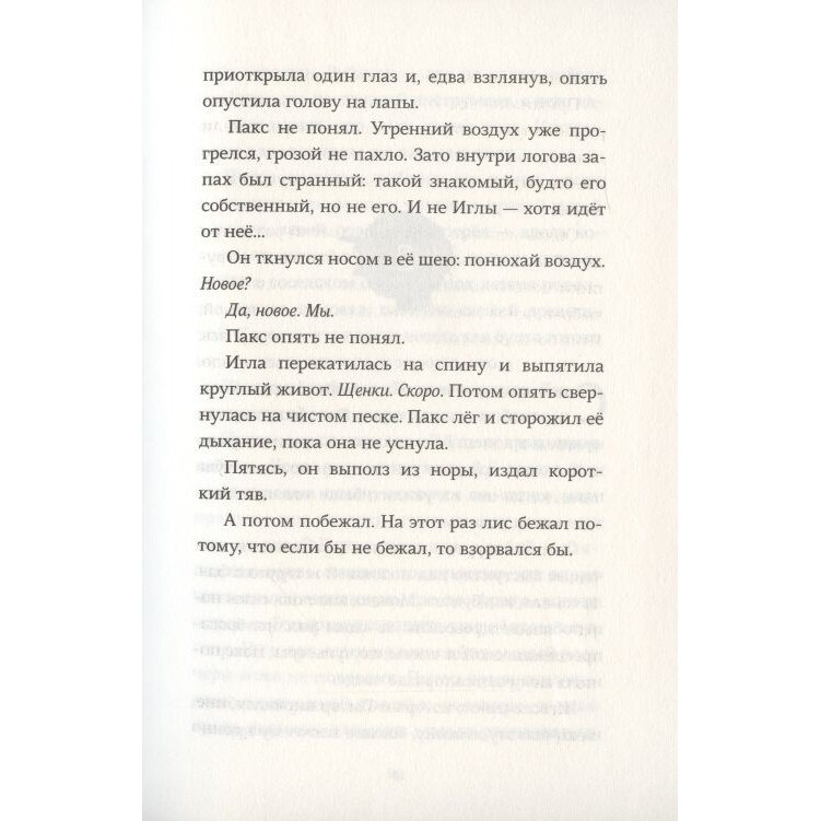 Новый «Пакс» сшибает с ног, действует, как болезнь, возрождающая к новой жизни, как испытание, пройдя которое становишься другим человеком — сильнее и чище. Такое испытание проходит 13-летний Питер, за один год повзрослевший на целую жизнь. Он начинает с чистого листа, потому что у него ничего не осталось. Ничего и никого – так ему кажется после того, как он теряет отца. Сначала мать, потом Пакс и вот — отец. И Питер решается — решается никого больше не любить, чтобы не дай бог не пережить еще раз то, что оставляет в сердце кровоточащую рану – боль утраты. Он ожесточает свое сердце против всех — и первым делом против тех, кому он по-настоящему дорог. Это путь к новой жизни – так он думает. Но кто-то наверху думает иначе. Кто-то думает, что любовь и тепло объятий – лучшее лекарство от горя и сжимающей горло тоски. Питеру придется многое пережить, чтобы понять, что это правда. Книга о взрослении, о том, через какие тернии нужно продраться, чтобы узнать какой ты и чего хочешь. О том, что порой нужно пройти сквозь терзающую тебя боль еще раз – чтобы отпустить ее навсегда. О страхе и привязанности, о стыде и ответственности, о выборе и осознанности — о том, как человек становится самим собой.