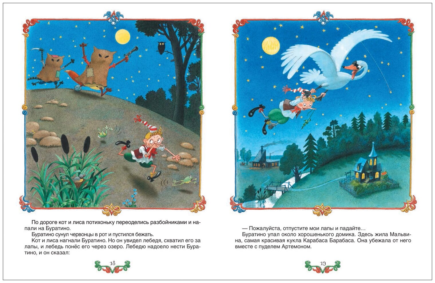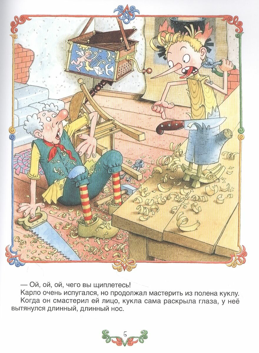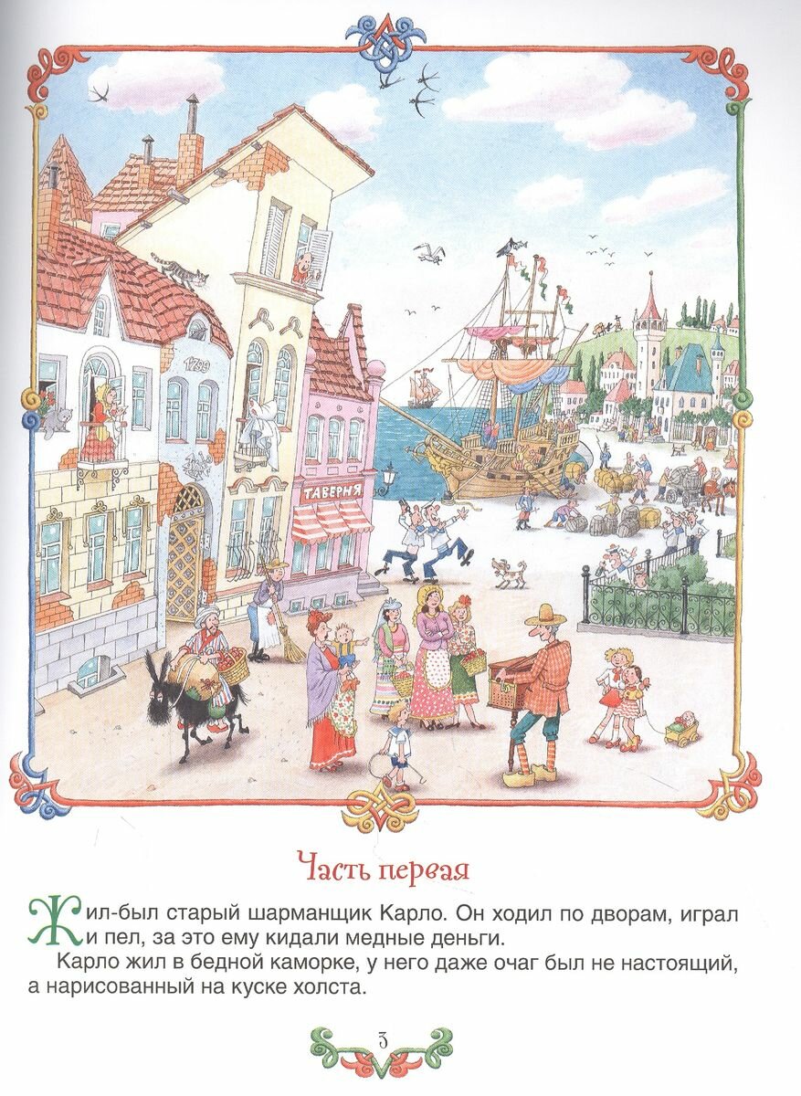 Рисунки веселые, интересные, с подробностями. Всегда интересен и задний план. Своеобразная, очень узнаваемая техника. Одни башмаки чего стоят. Рисунки качественно напечатаны. Может Буратино и не красавчик, зато веселый. Да и всегда есть выбор, можно купить либо красивого Буратино с иллюстрациями Л.Владимирского, либо такого веселого и юморного в изображении Огородниковых.