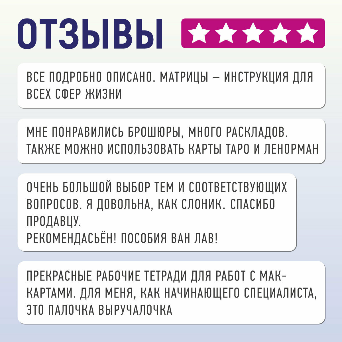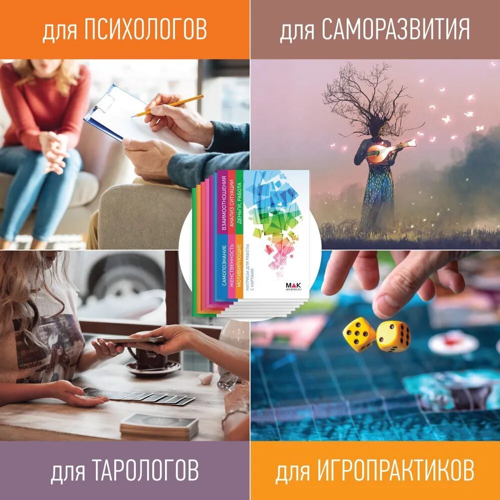 Матрицы можно использовать в работе психолога или для самостоятельных занятий. Расклады подойдут для любых видов карт: метафорических, оракулов или карт Таро. Брошюры удобно носить с собой на выездные консультации, они не занимает много места и мало весят.