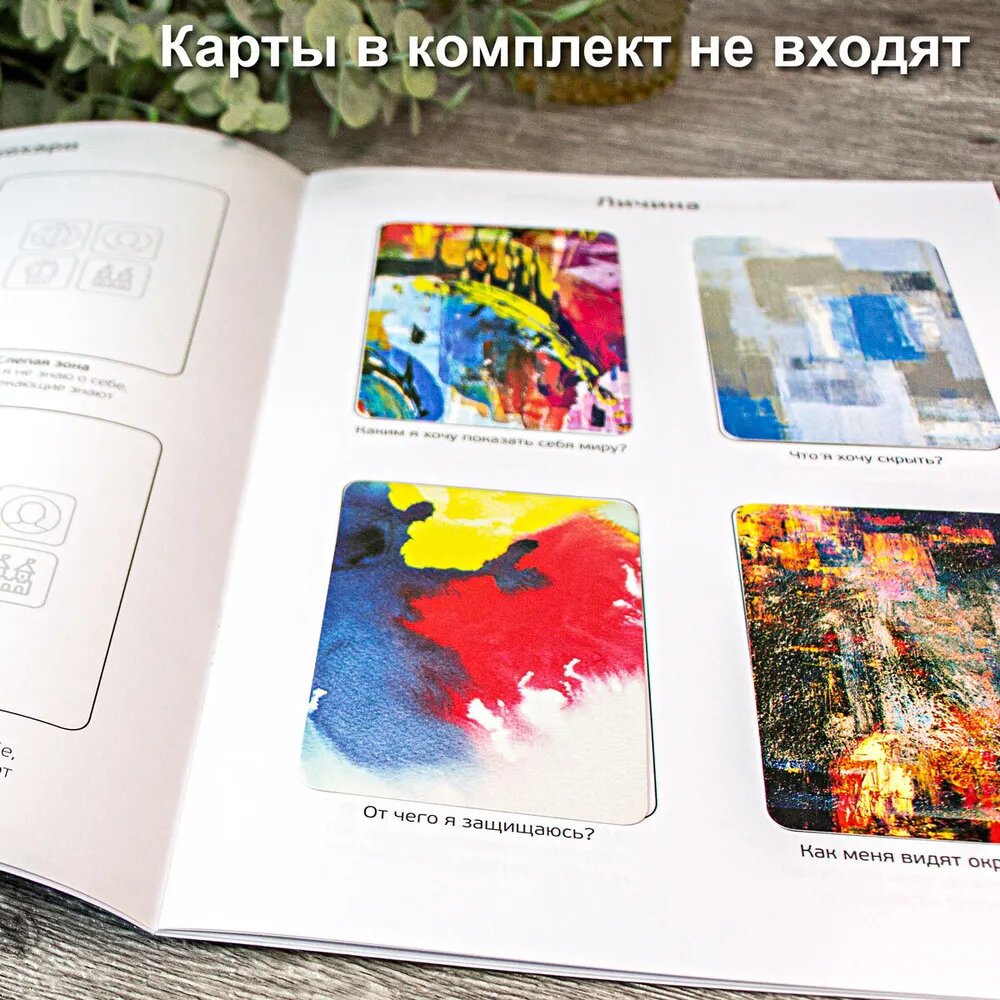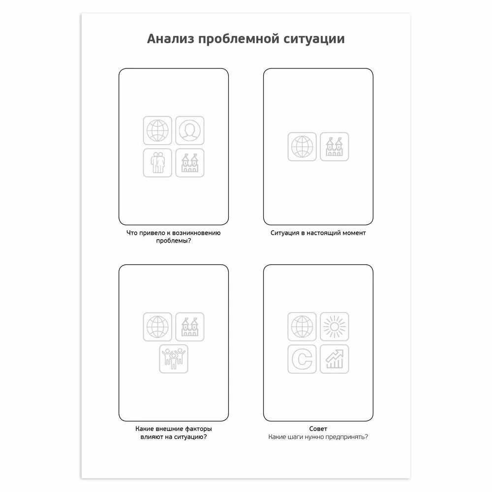 В каждой рамке расположены пиктограммы, обозначающие вид метафорических ассоциативных карт, который более всего подходит для конкретной позиции. Виды метафорических карт, а также порядок работы с матрицами и основные правила работы с картами описаны в брошюрах.