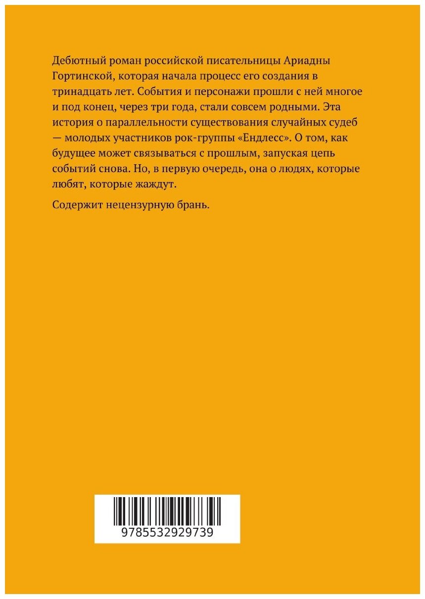 Дебютный роман российской писательницы Ариадны Гортинской, которая начала процесс его создания в тринадцать лет. События и персонажи прошли с ней многое и под конец, через три года, стали совсем родными. Эта история о параллельности существования случайных судеб – молодых участников рок-группы «Ендлесс». О том, как будущее может связываться с прошлым, запуская цепь событий снова. Но, в первую очередь, она о людях, которые любят, которые жаждут.