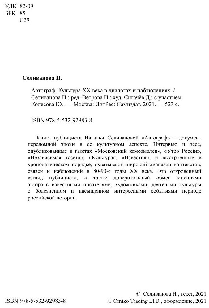 Книга публициста Натальи Селивановой «Автограф» – документ переломной эпохи в ее культурном аспекте. Интервью и эссе, опубликованные в газетах «Московский комсомолец», «Утро Россiи», «Независимая газета», «Культура», «Известия», и выстроенные в хронологическом порядке, охватывают широкий диапазон контекстов, связей и наблюдений в 80-90-е годы ХХ века. Это откровенный взгляд публициста, а также доверительный обмен мнениями автора с известными писателями, художниками, деятелями культуры о болезненном и насыщенном интересными событиями периоде российской истории.