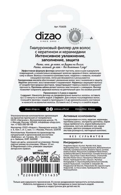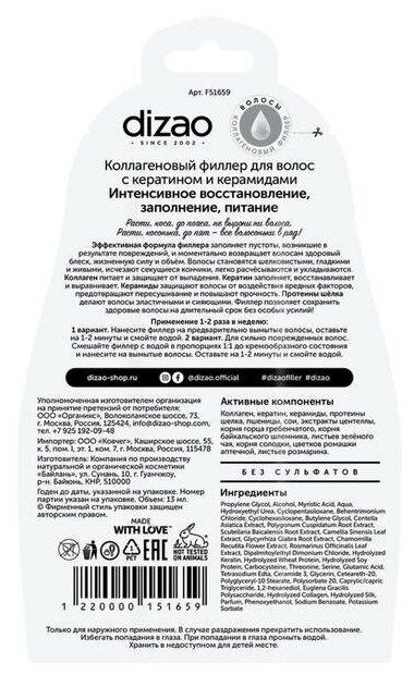Описание Косметика по уходу за кожей Dizao - это эффективные средства, созданные с любовью к красоте и с заботой о природе. Мы используем в своей косметике только натуральные ингредиенты и не тестируем нашу продукцию на животных. Более 18 лет опыта позволяют нам говорить, что мы стали профессионалами в области создания качественных и эффективных средств по уходу за кожей для лица, для женщин и мужчин. Внешний вид: прозрачная эссенция, жидкая, бесцветная Мгновенный эффект (1-2 минуты.) Эффект после 1-ого применения. Коллаген - белок, отвечающий за молодость нашего организма. Со временем процесс выработки коллагена замедляется, и недостаток молекул может привести к сухости, ломкости и расслаиванию прядей. Гидролизованный коллаген налаживает обмен веществ, восстанавливает структурную целостность волос, дает волосам и коже питание, укрепляет и защищает их от выпадения, активно впитывает молекулы воды и помогает восстановить гидробаланс волос и кожи головы. Упрощает расчесывание и укладку. Проникая вглубь структуры волоса, филлер оказывает комплексное восстанавливающее действие всего за 1 минуту, заполняя пустоты, возникшие в результате повреждений, сглаживает чешуйки, устраняя дефекты, интенсивно питает и увлажняет. Эффект уже после первого применения! Восстановление. Питание. Увлажнение. Укрепление. Защита. Блеск. Эластичность. Легкость расчесывания. Мягкость волос. Против секущихся концов. Активные компоненты: Коллаген - питает и защищает от выпадения. Кератин - заполняет, восстанавливает и выравнивает. Керамиды - защищают волосы от воздействия вредных факторов, предотвращают пересушивание и повышают прочность. Протеины шелка- делают волосы эластичными и сияющими. Протеины пшеницы и сои - эффективно восстанавливают, увлажняют и уплотняют структуру поврежденных волос. Экстракты центеллы, корня горца гребенчатого, корня байкальского шлемника, листьев зелёного чая, корня солодки, цветков ромашки аптечной, листьев розмарина - комплекс растительных экстрактов укрепляет, увлажняет, питает, улучшает общее состояние волос, преображая их. Результат: Каждая женщина мечтает о красивых и здоровых волосах. Коллагеновый филлер для волос с кератином и керамидами Dizao мгновенно преобразит ваши волосы, сделает их невероятно сильными, здоровыми, шелковистыми и блестящими без особых усилий!Состав PROPYLENE GLYCOL, ALCOHOL, MYRISTIC ACID, AQUA, HYDROXYETHYL UREA, CYCLOPENTASILOXANE, BEHENTRIMONIUM CHLORIDE, CYCLOHEXASILOXANE, BUTYLENE GLYCOL, CENTELLA ASIATICA EXTRACT, POLYGONUM CUSPIDATUM ROOT EXTRACT, SCUTELLARIA BAICALENSIS ROOT EXTRACT, CAMELLIA SINENSIS LEAF EXTRACT, GLYCYRRHIZA GLABRA ROOT EXTRACT, CHAMOMILLA RECUTITA FLOWER EXTRACT, ROSMARINUS OFFICINALIS LEAF EXTRACT, DIPALMITOYLETHYL DIMONIUM CHLORIDE, HYDROLYZED KERATIN, HYDROLYZED WHEAT PROTEIN, HYDROLYZED SOY PROTEIN, CARBOCYSTEINE, THREONINE, SERINE, GLUTAMIC ACID, TETRASODIUM EDTA, CERAMIDE 3, GLYCERIN, CETEARETH-20.