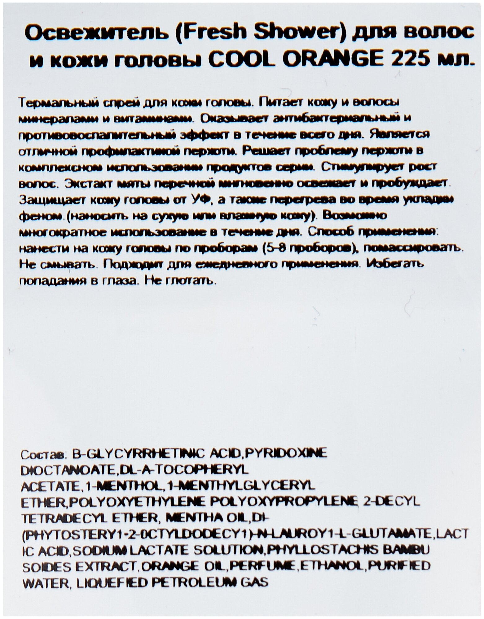 В повседневной жизни наши волосы подвергаются множеству различных негативных факторов, и в первую очередь – пересыханию. Постоянное увлажнение волос доступно далеко не всегда, но специалисты компании Lebel Cosmetics разработали удивительно эффективное средство - Освежитель - спрей Cool Orange. Это термальная вода в виде спрея, предназначенная для увлажнения кожи головы и волос, когда это необходимо. Освежитель основан на растительной формуле и в своей основе содержит минеральную воду, которая насыщает кожу необходимыми минералами и влагой. Апельсиновое масло предотвращает загрязнение волос и растворяет жир на коже головы, не давая ему скапливаться в порах и сальных протоках. Экстракт корня бамбука увлажняет кожу, препятствуя высыханию эпидермиса, вытяжка лакричника снимает зуд и шелушение, предотвращает появление перхоти. Масло перечной мяты охлаждает кожу, оставляя ощущение свежести даже в самый жаркий день, а масло жожоба смягчает волосы, даря им гибкость и эластичность. От солнечных лучей ваши волосы защитит экстракт зеленого чая. Не беспокойтесь о своих волосах, занимайтесь своими делами.